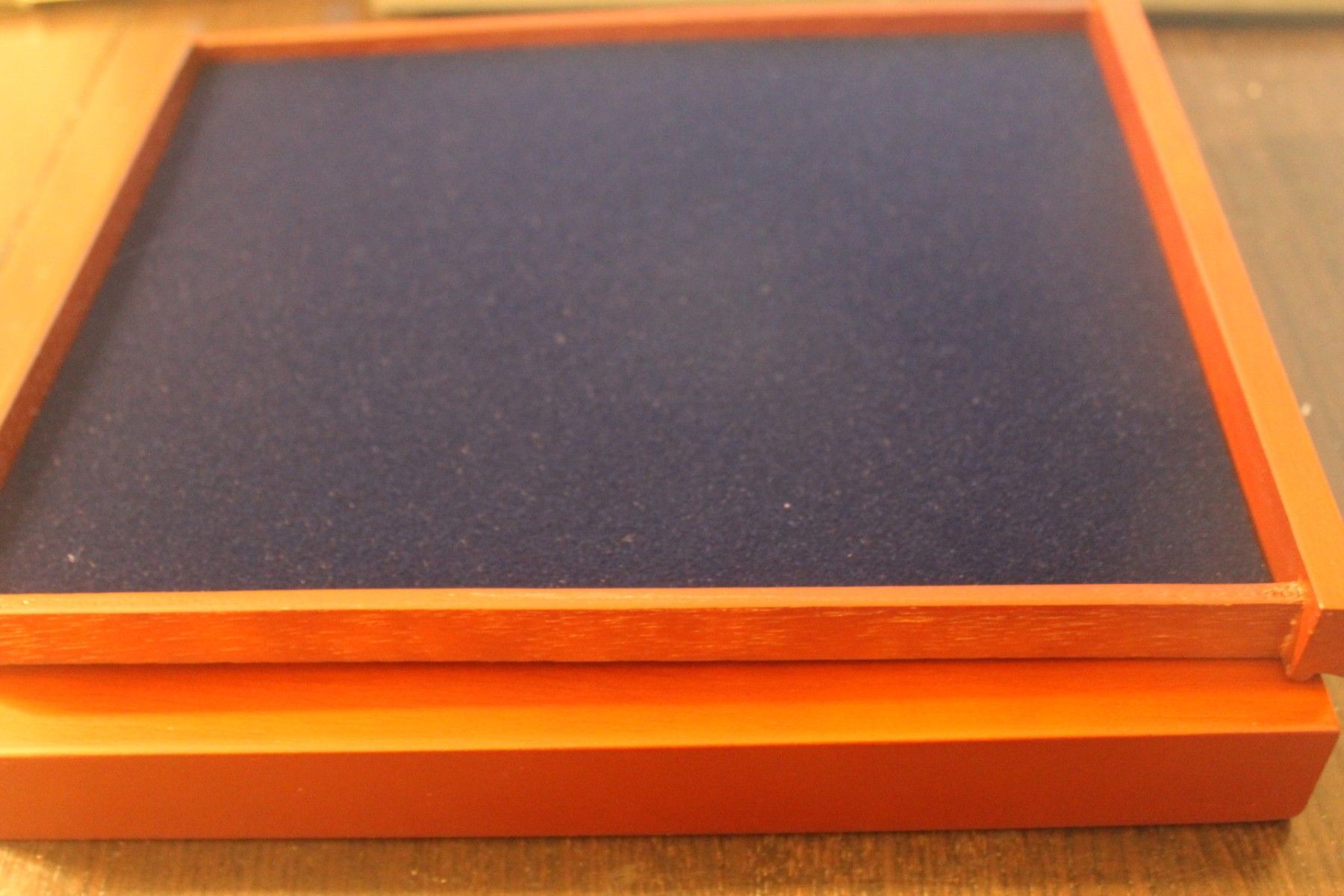Ein Nova Exquisite Schubladen-Element besteht aus einer Schublade mit königsblau beflocktem Einsatz und einem Holz-Schubteil. Die schräg-gefräste Griffleiste erleichtert das Aufziehen der Schublade. Der Echtholz-Rahmen auf dem Schubteil gewährleistet eine exakte Positionierung beim Stapeln der Eleme