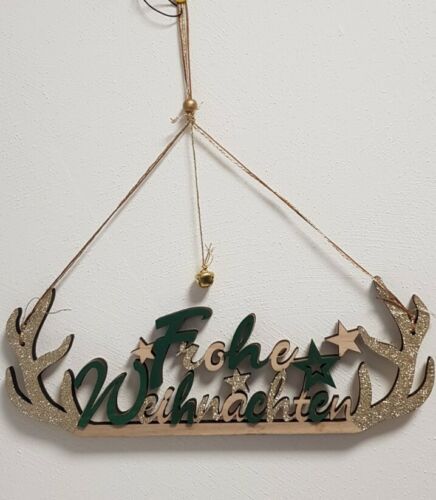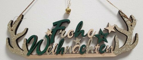 Holz Schriftzug zum Hängen Frohe Weihnachten Deko grün gold Glitzer 30x38cm