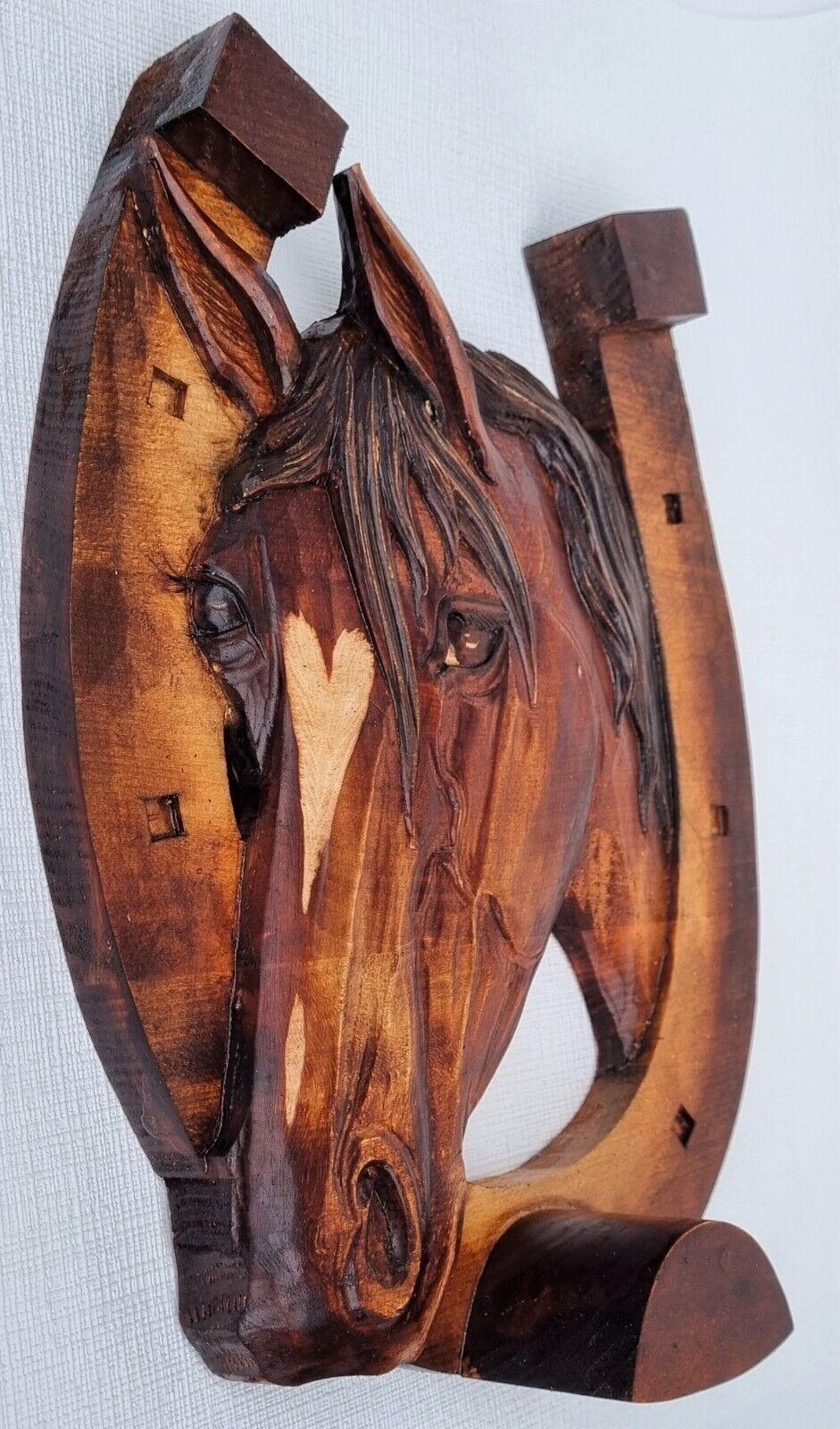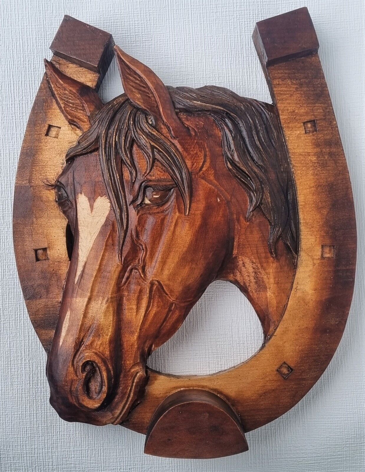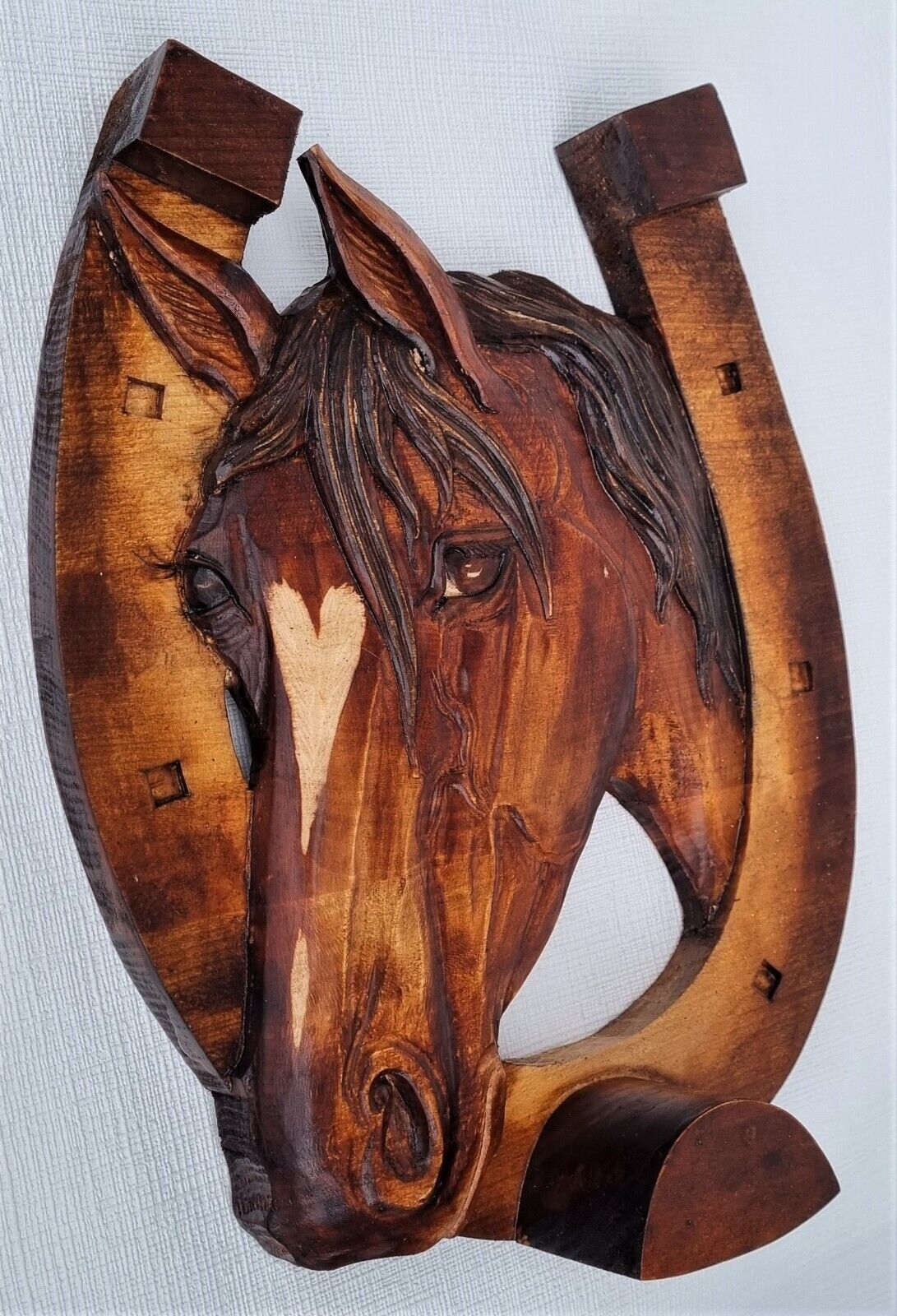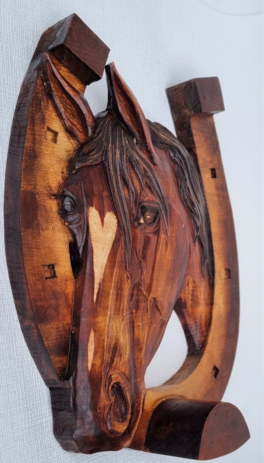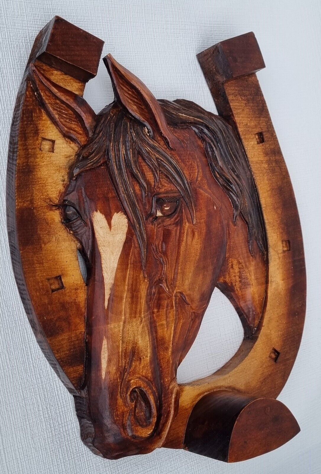 Holzbild Pferdekopf im Hufeisen Wandrelief Schnitzerei Handarbeit Masivholz HERZ