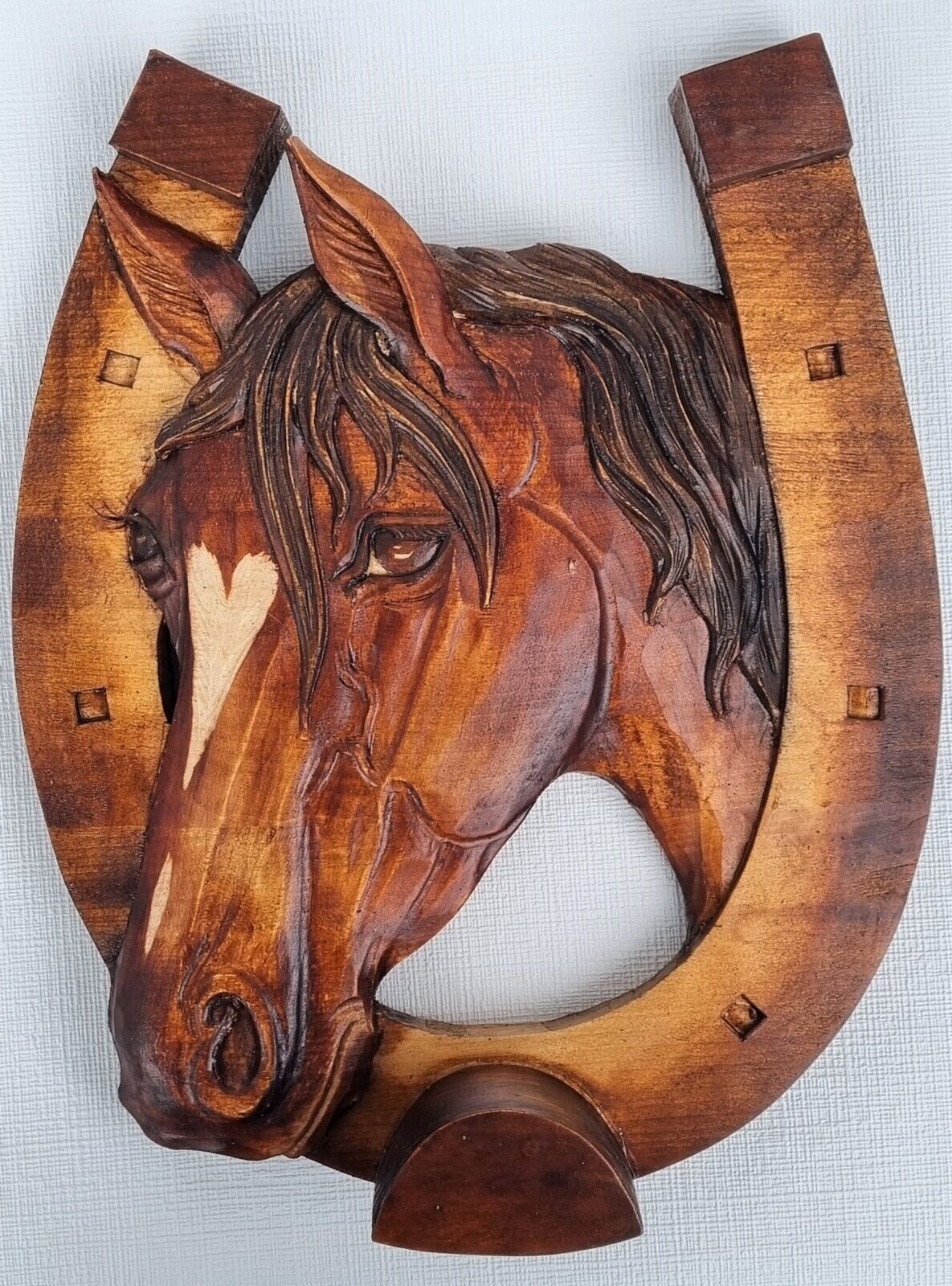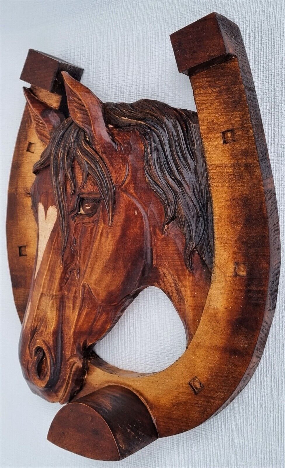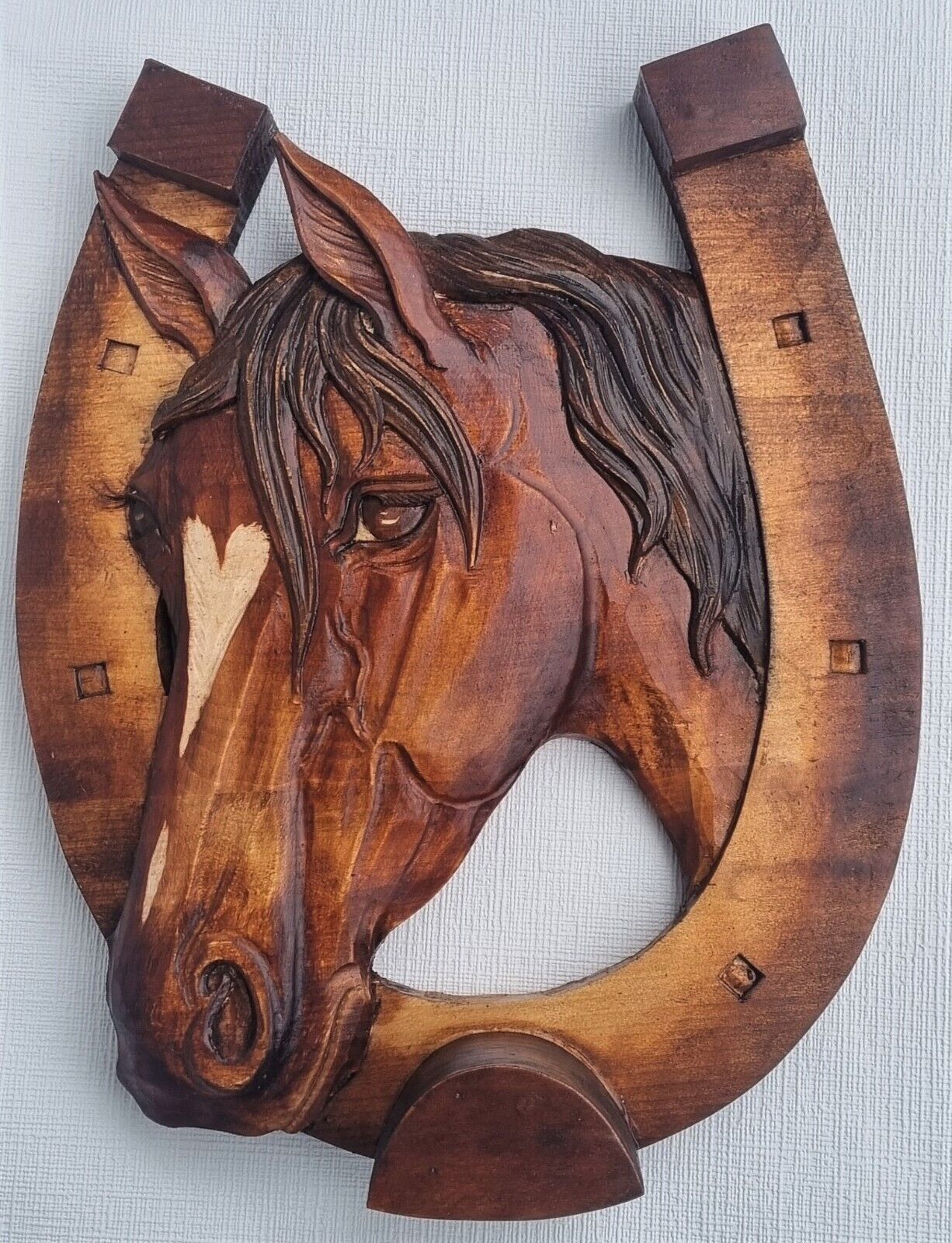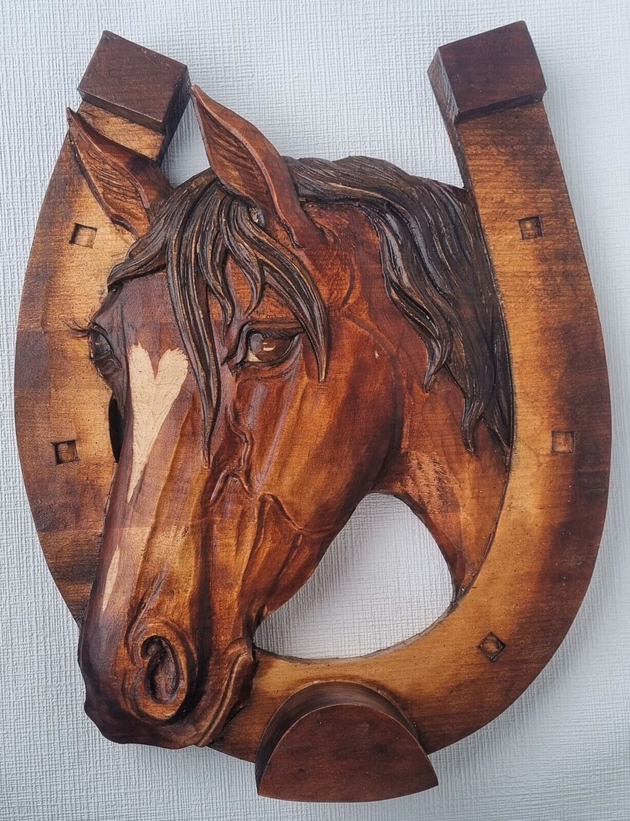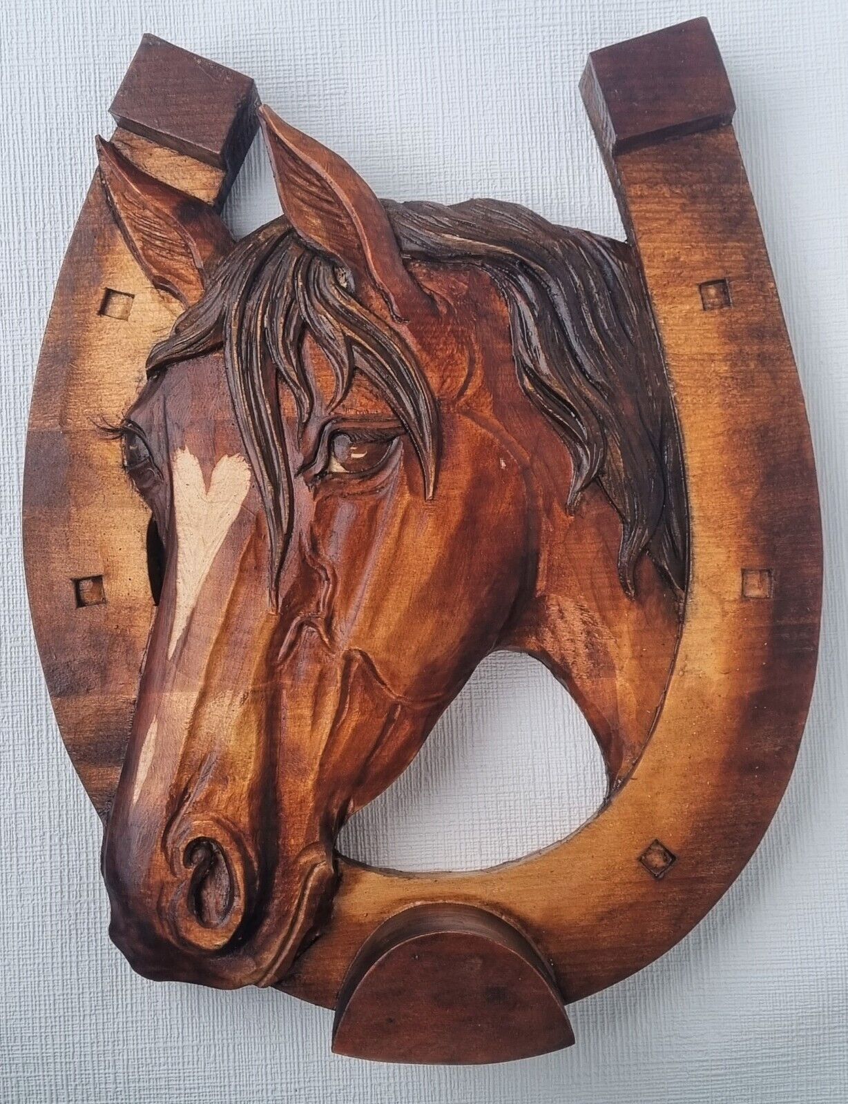 Holzbild Pferdekopf im Hufeisen Wandrelief Schnitzerei Handarbeit Masivholz HERZ