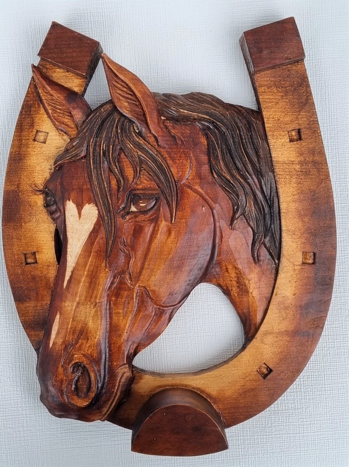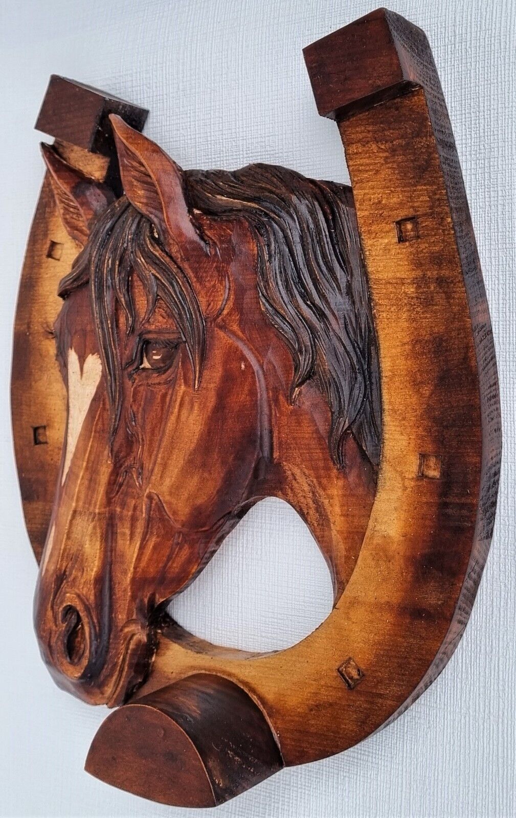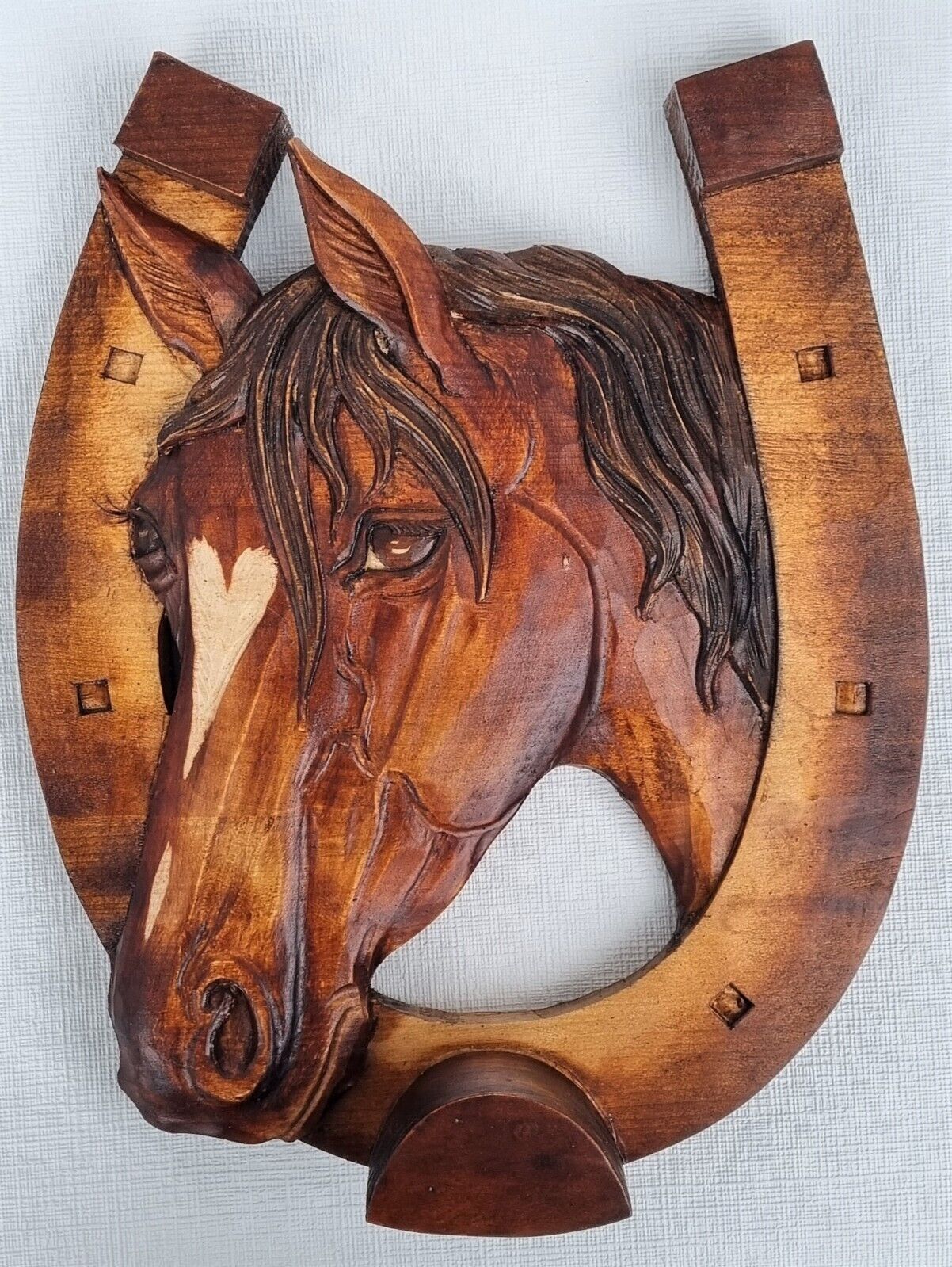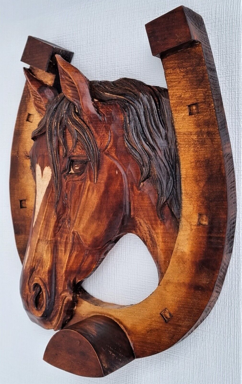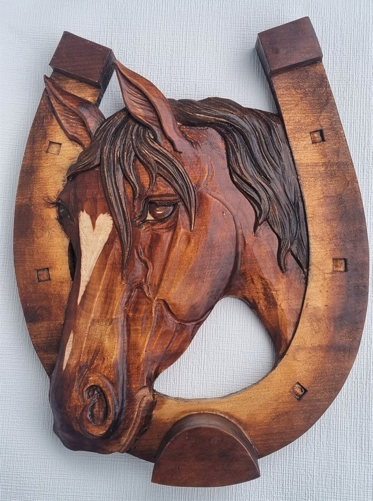 Holzbild Pferdekopf im Hufeisen Wandrelief Schnitzerei Handarbeit Masivholz HERZ