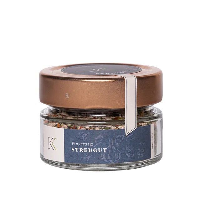Holzbox mit Tragekordel und 1Fl Pinot Rosé brut, 2x Fingersalz (Blütenzauber / Streugut) 1x Gewürz (Pasta la Vista)