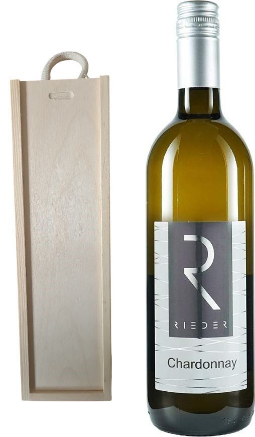 Holzbox mit Tragekordel und Schiebedeckel dazu eine Flasche Wein Chardonnay