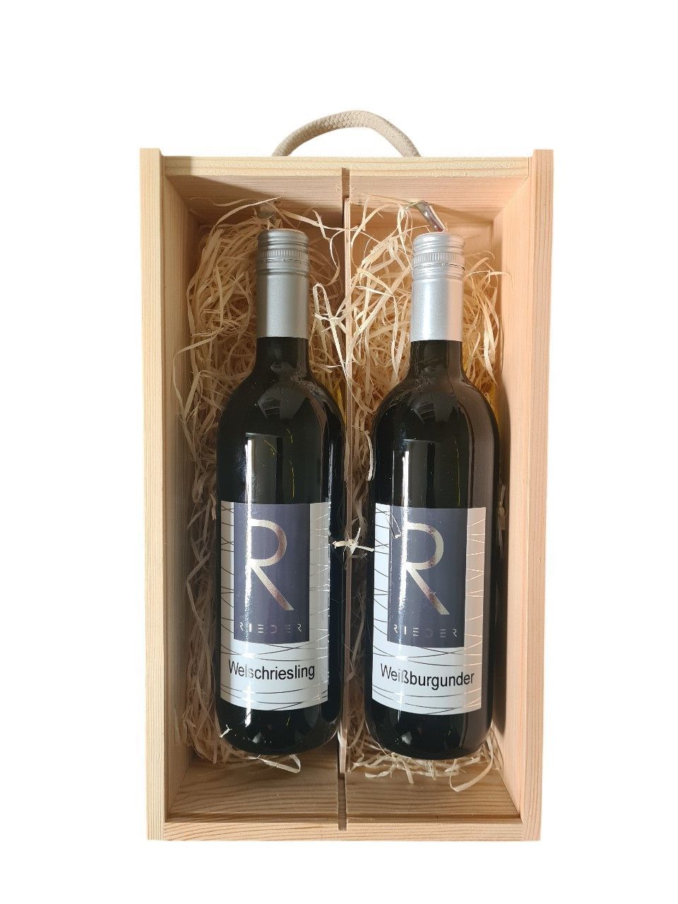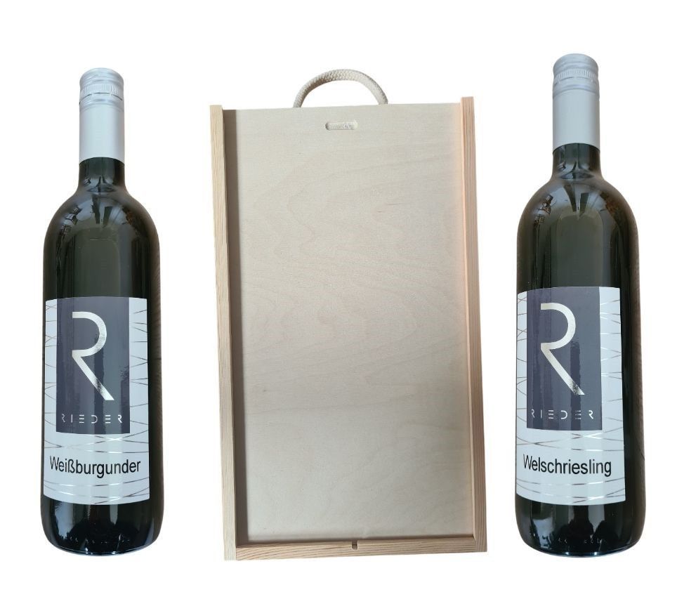 Holzbox mit Tragekordel und Schiebedeckel dazu Weißburgunder und Welschriesling