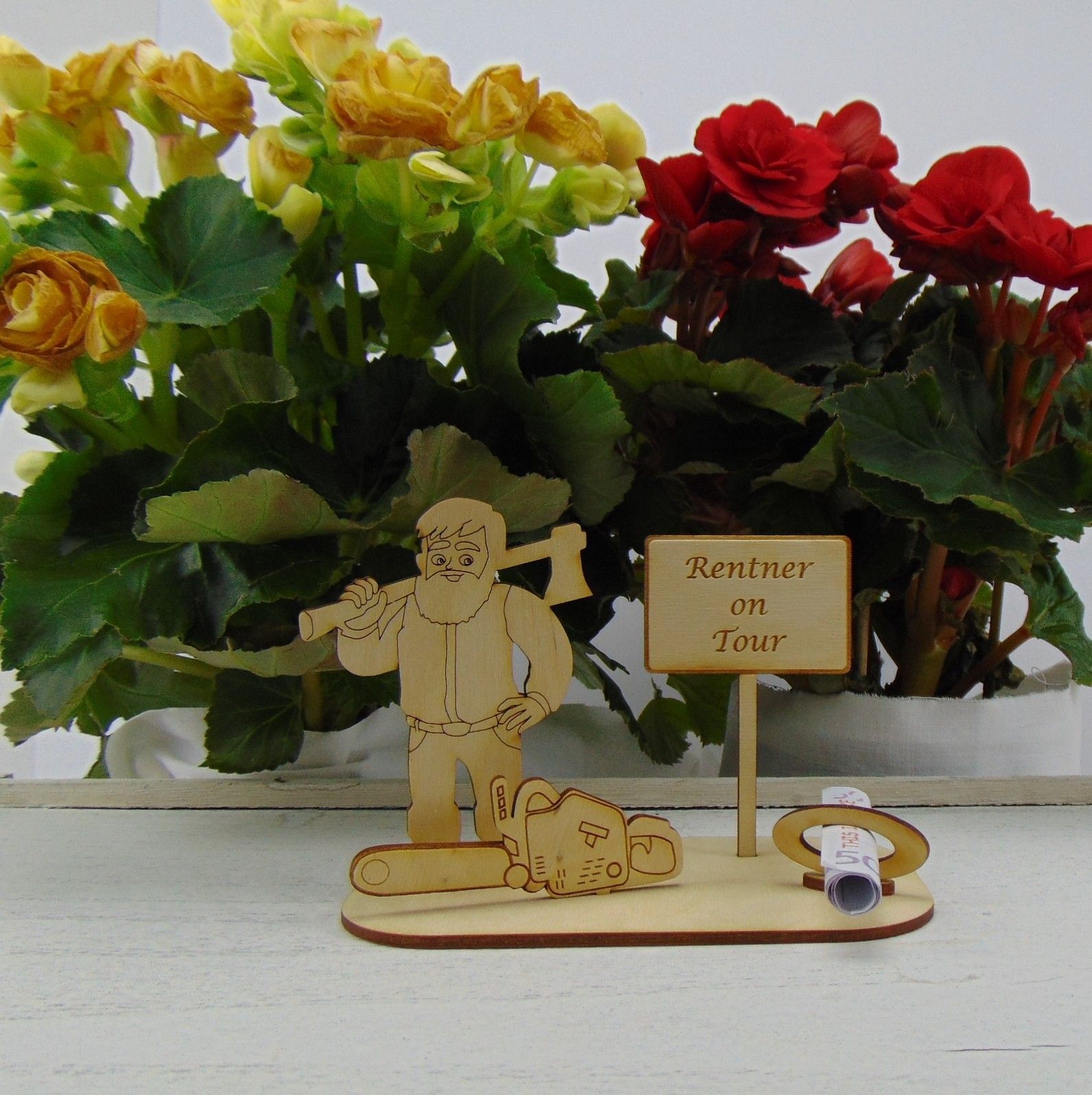 Geldgeschenkeset - Holzfäller "Rentner on Tour" Der Holzfäller ist 10 cm hoch und 7 cm breit, mit einer Unterplatte in der Größe von 14 x 8 cm zum Hinstellen. Wir liefern dazu einen Gutschein- oder Geldscheinhalter, sowie ein Spruchschild. Sie erhalten insgesamt 7 Teile, die zusammengesteckt und für eine Langlebigkeit geklebt werden können.