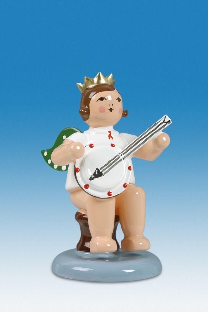 Holzfigur Engel sitzend mit Banjo und Krone Höhe 6cm NEU Holzengel Instrument Sei