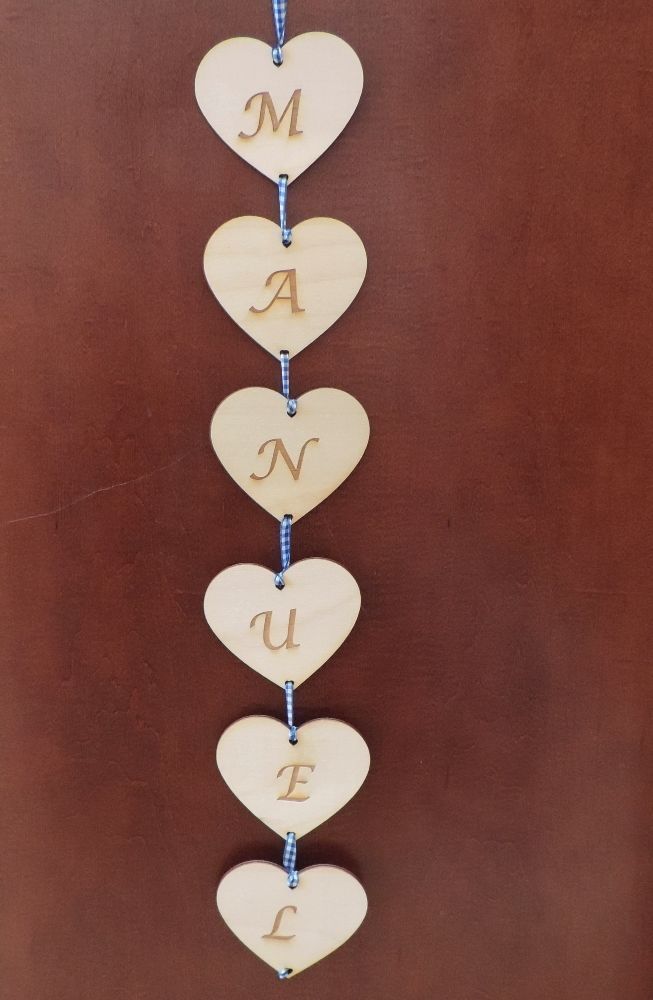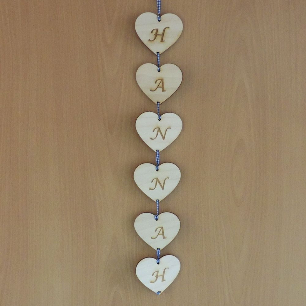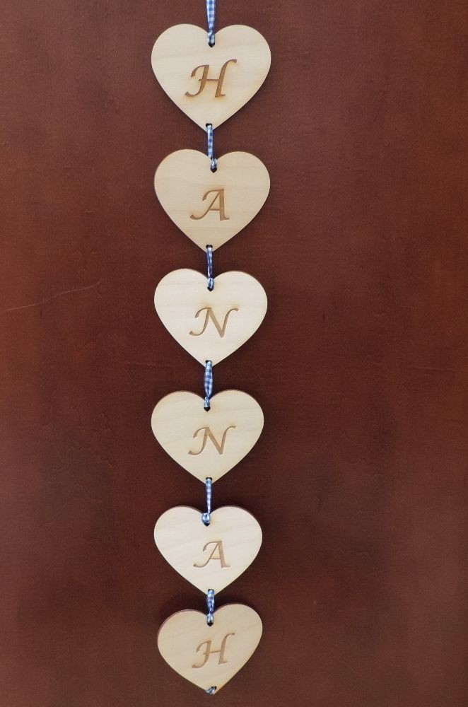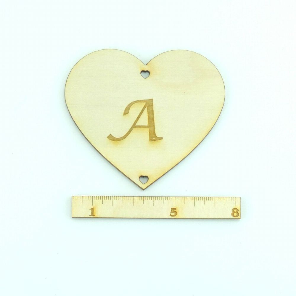 Herz mit gravierten Buchstaben Das Herz hat eine Breite von 80mm und 2 kleine Löcher in Herzform um Sie untereinander zu hängen. Sie werden aus 3mm starkem Birkensperrholz gelasert und mit dem von Ihnen gewählten Buchstaben graviert. Die Herzen können mit einem Band aufgehängt werden oder mit einem