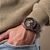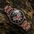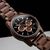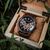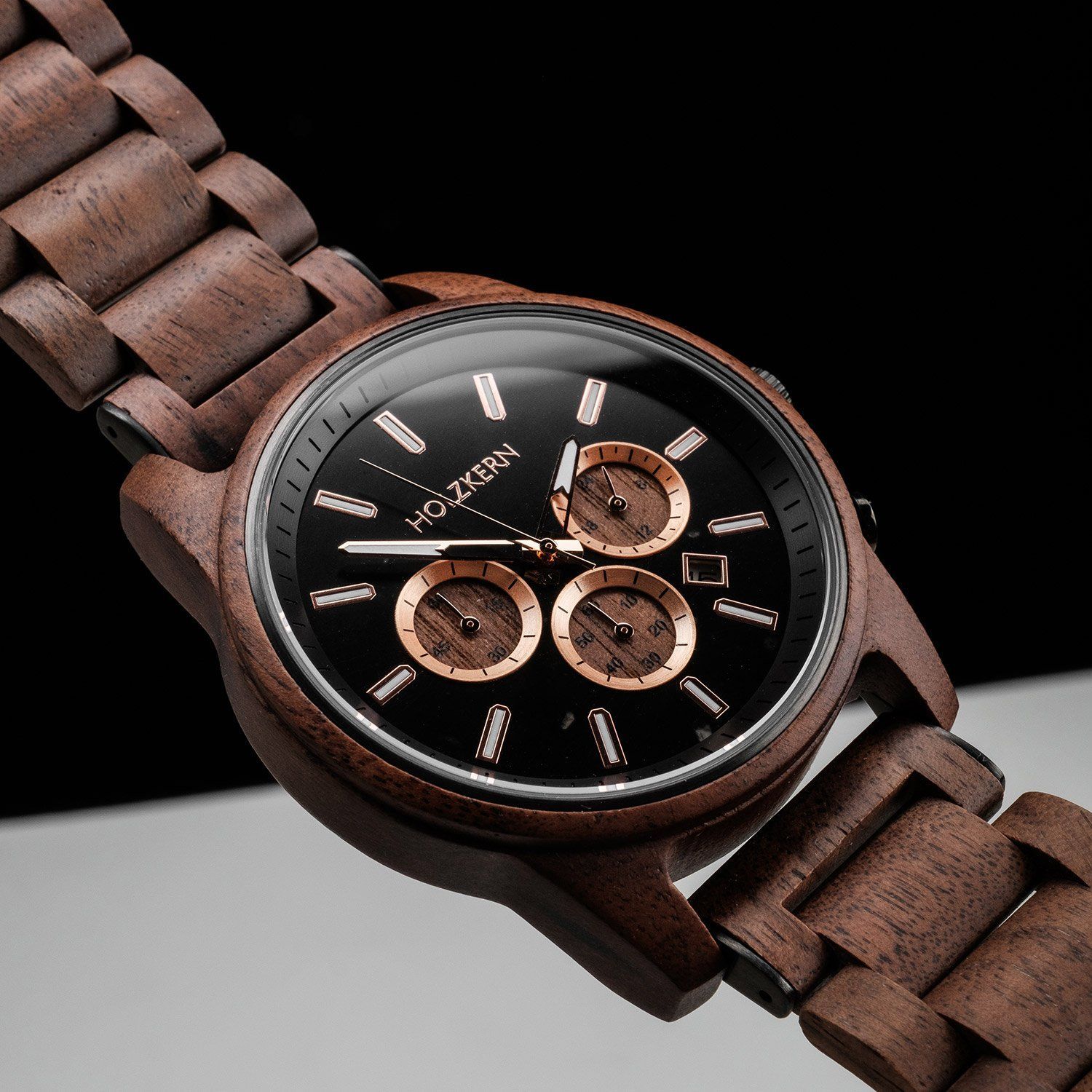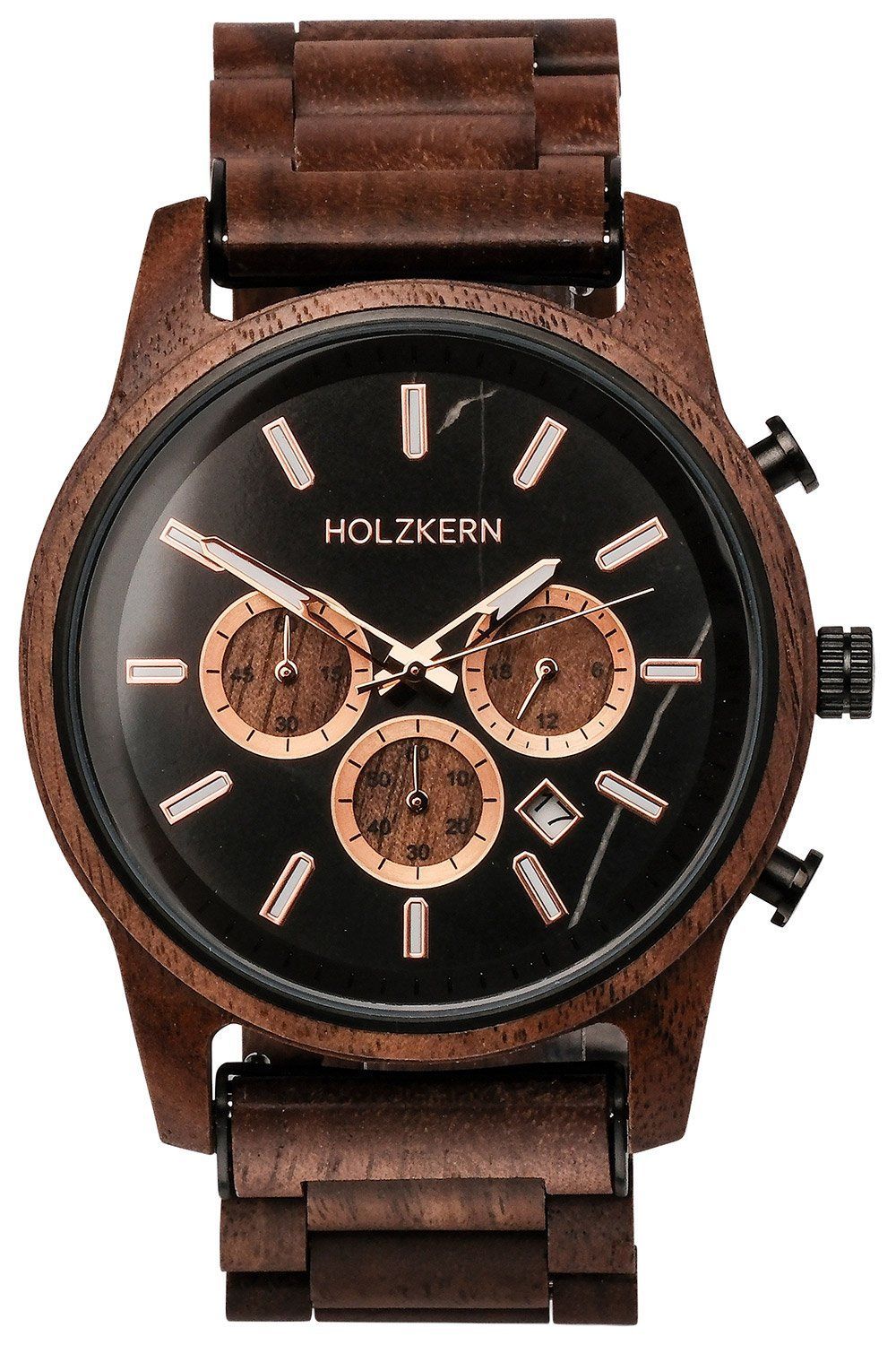 interessante Armbanduhr für Männer, präzises japanisches Quarzwerk, Datumsanzeige, Stoppuhr bis 60 Minuten in Sekundenschritten, 24-Stunden-Anzeige, Zifferblatt aus schwarzem Marmor, roségoldfarbene Details, hellbraune Hilfszifferblätter, lumineszierende Zeiger und Indizes, zentraler Sekundenzeiger, Gehäuse aus dunkelbraunem Walnussholz, geschraubter Edelstahl-Gehäuseboden, geriffelte Krone, kratzunempfindliches Mineralglas, Armband aus dunkelbraunem Walnuss-Holz, Sicherheitsfaltschließe aus ges