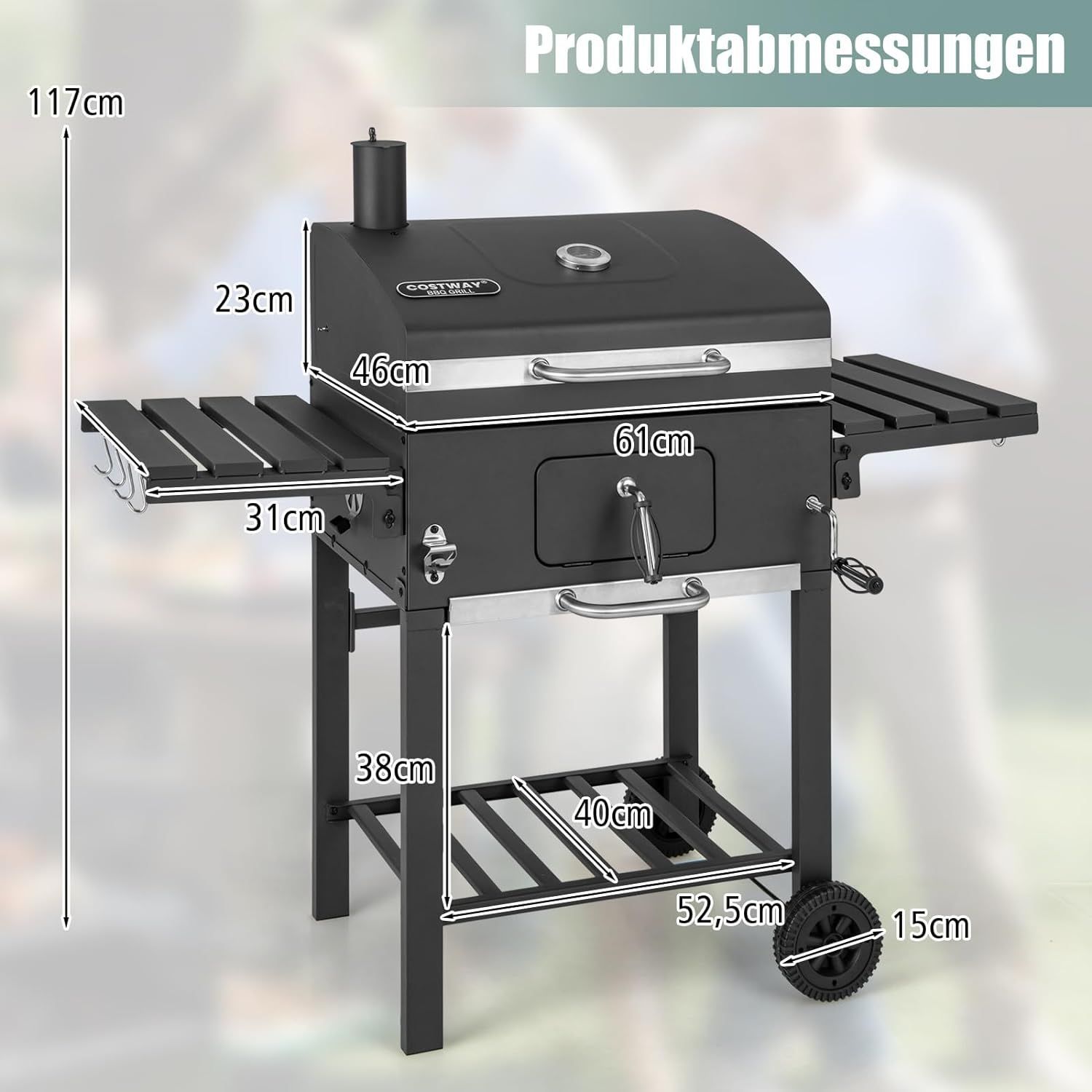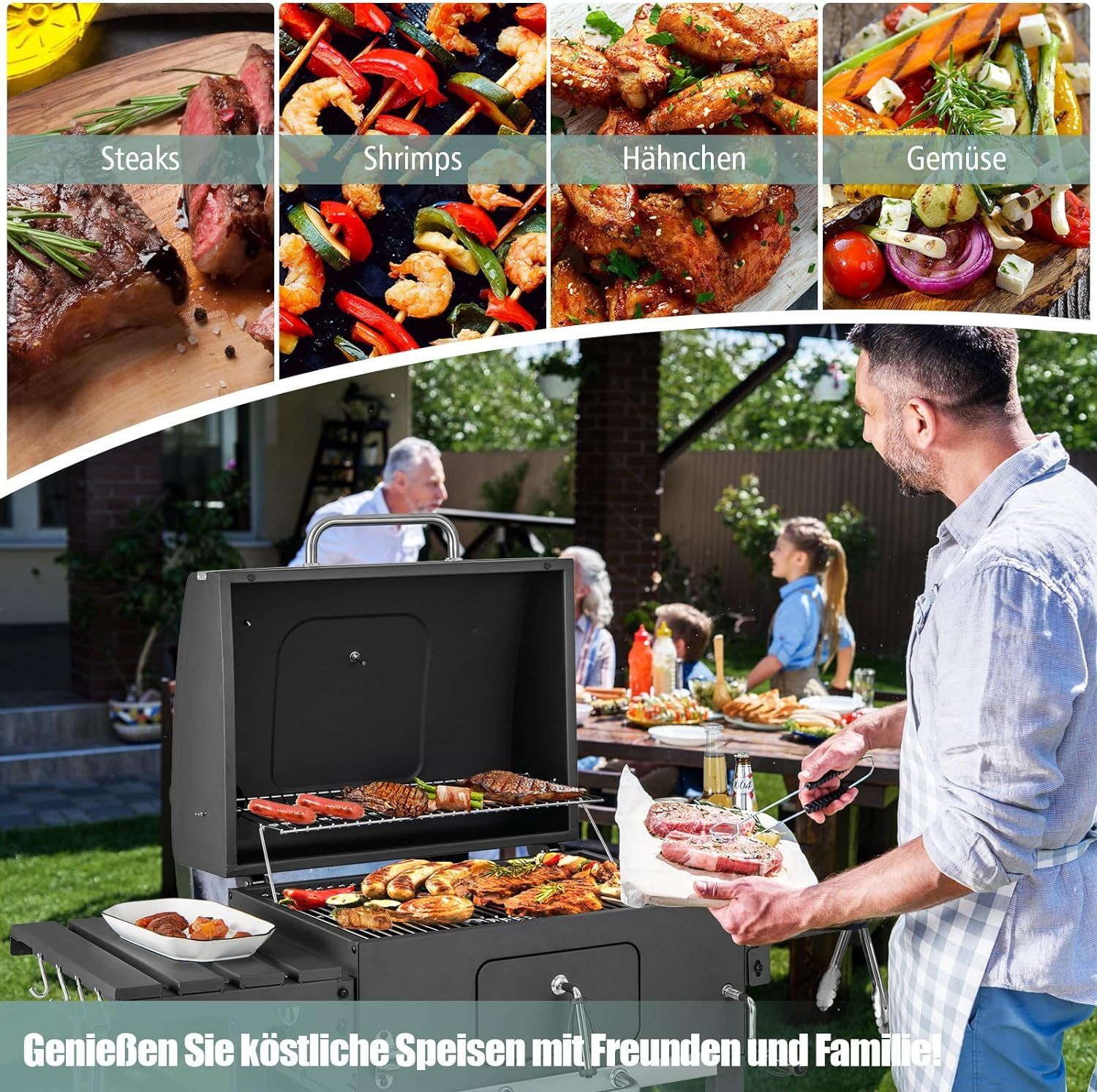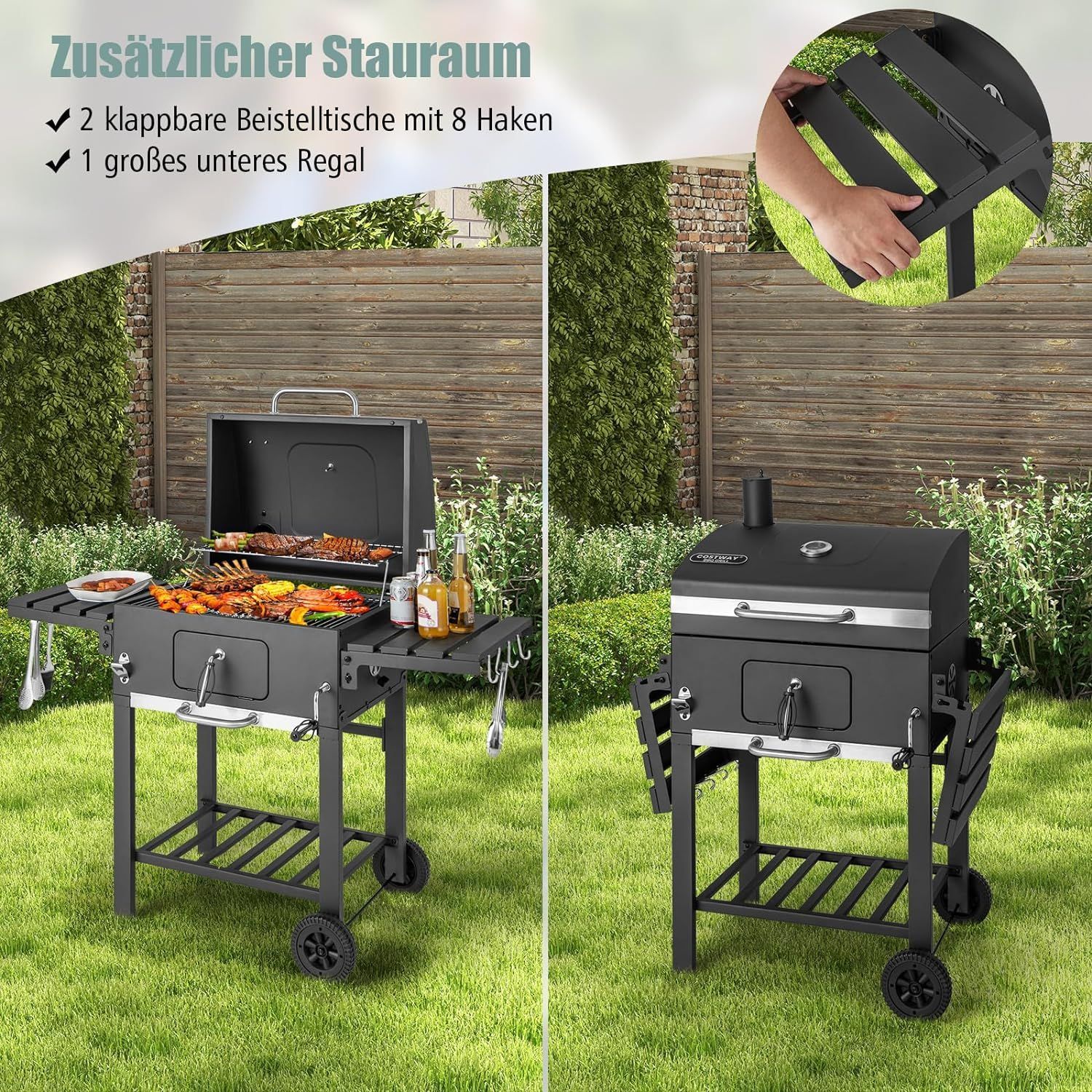 Holzkohlegrill mit Deckel, Grillwagen mit 2 klappbaren Beistelltischen, 8 Haken