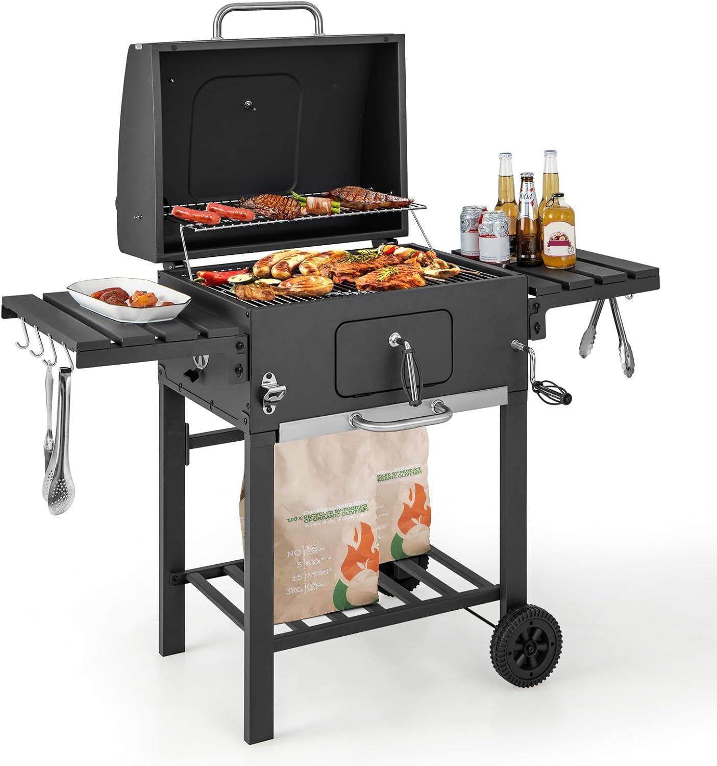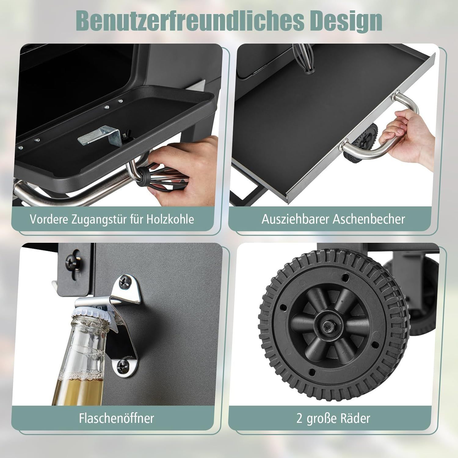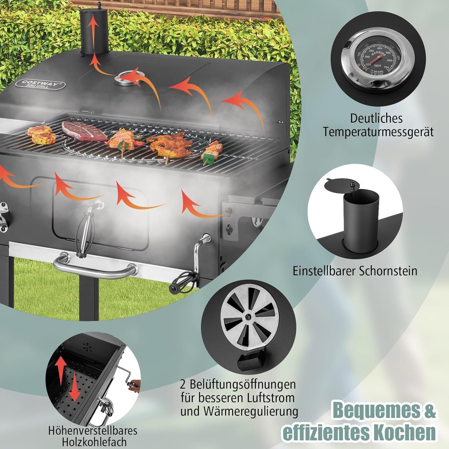 Holzkohlegrill mit Deckel, Grillwagen mit 2 klappbaren Beistelltischen, 8 Haken