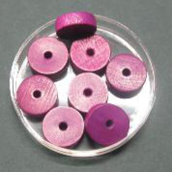 1 Beutel Holzperlen, Inhalt ca. 40 Stück, Farbe dunkellila, Perlengröße 12 x 4 mm.