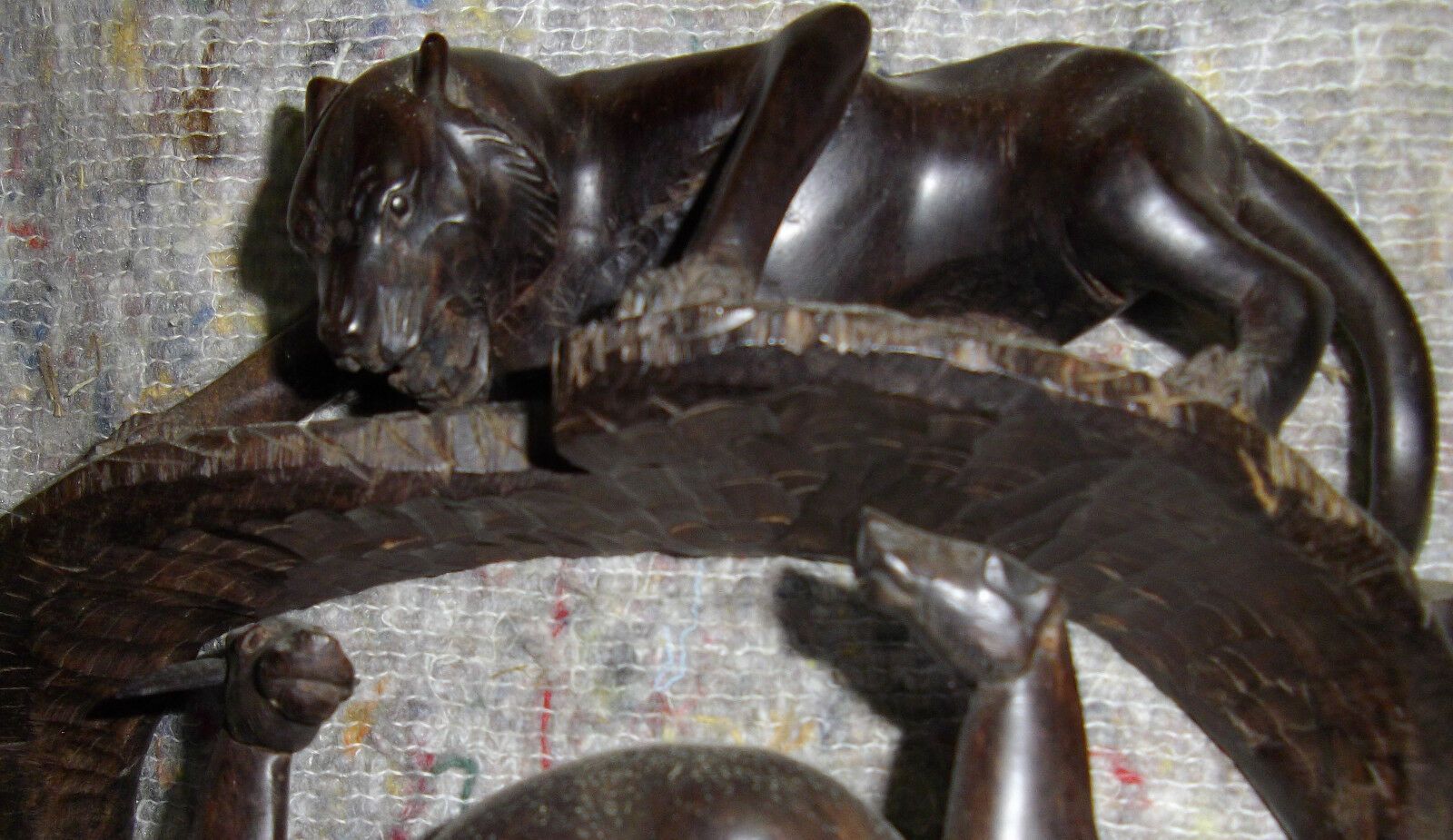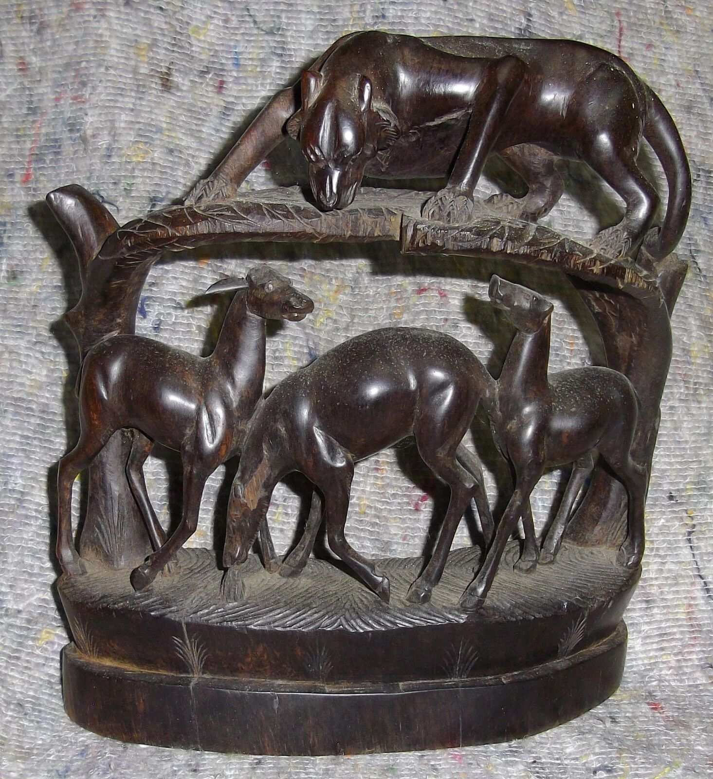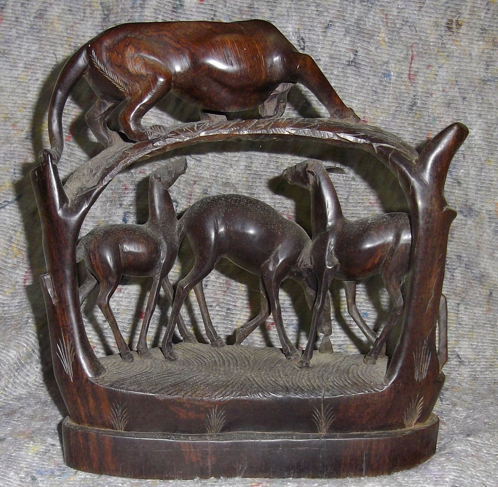 Holzfigur um 1970. Herkunft: Arusha heute Tansania . Motiv: Löwin und drei Antilopen . Geschnitzt in einem Stück! Das Holz ist schwarz. Es fehlen 2 Ohren der Antilopen. Maße: H 31 cm. Antikes am Deich - Inh: Oliver Kipp-Trense G M T Sprache erkennen Afrikaans Albanisch Arabisch Armenisch Aserbaidsch