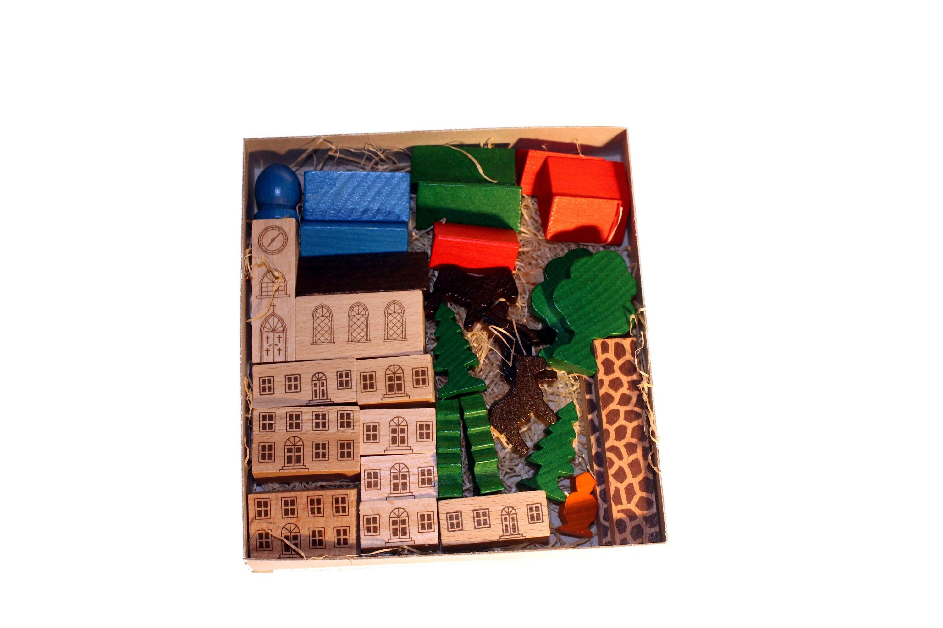Holzspielzeug Bergdorf mit Kirche im Beutel NEU Holzdorf Holzbaustein Dorf