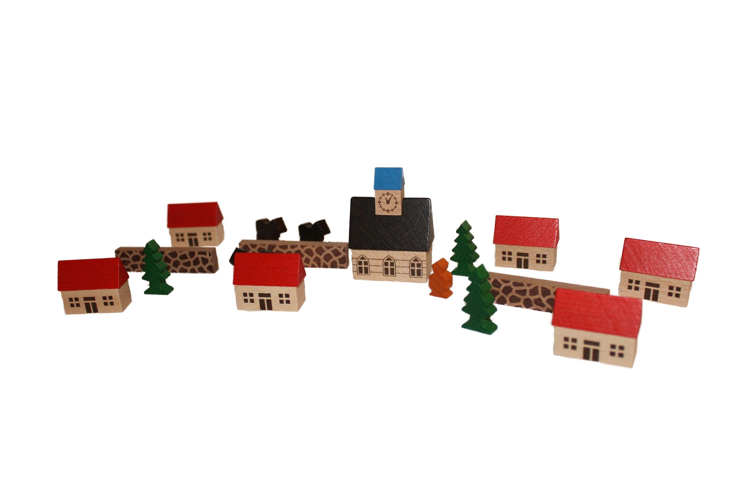 Holzspielzeug Spielzeugdorf mit Kirche im Beutel NEU Holzdorf Holzbaustein Dorf