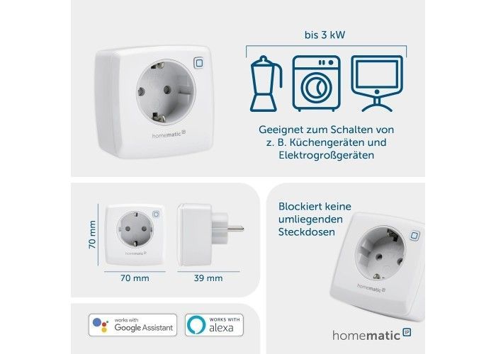 Homematic IP-Steckdose für Smart Home. Steuerung über Alexa und Google Assistant App