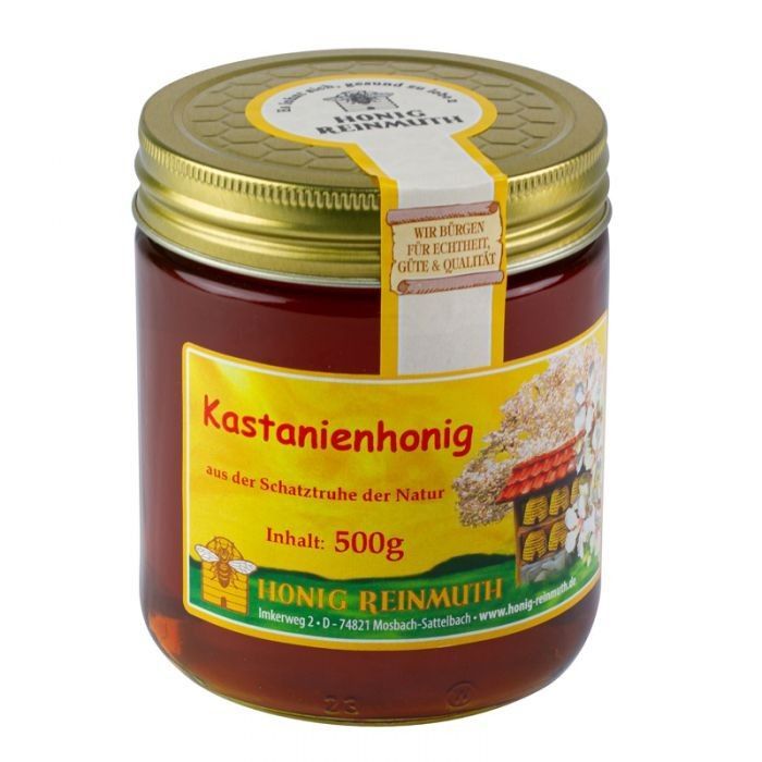 Kastanienhonig 500 g Kastanienhonig stammt vom Nektar der Edelkastanie (Castanea sativa), auch Esskastanie oder Marone genannt. Die Bienen sammeln den Nektar der wunderbar duftenden Blüten und den Honigtau der Blätter. Das Ursprungsland ist Italien, eher selten kommt er aus Spanien. Sie bereiten dar