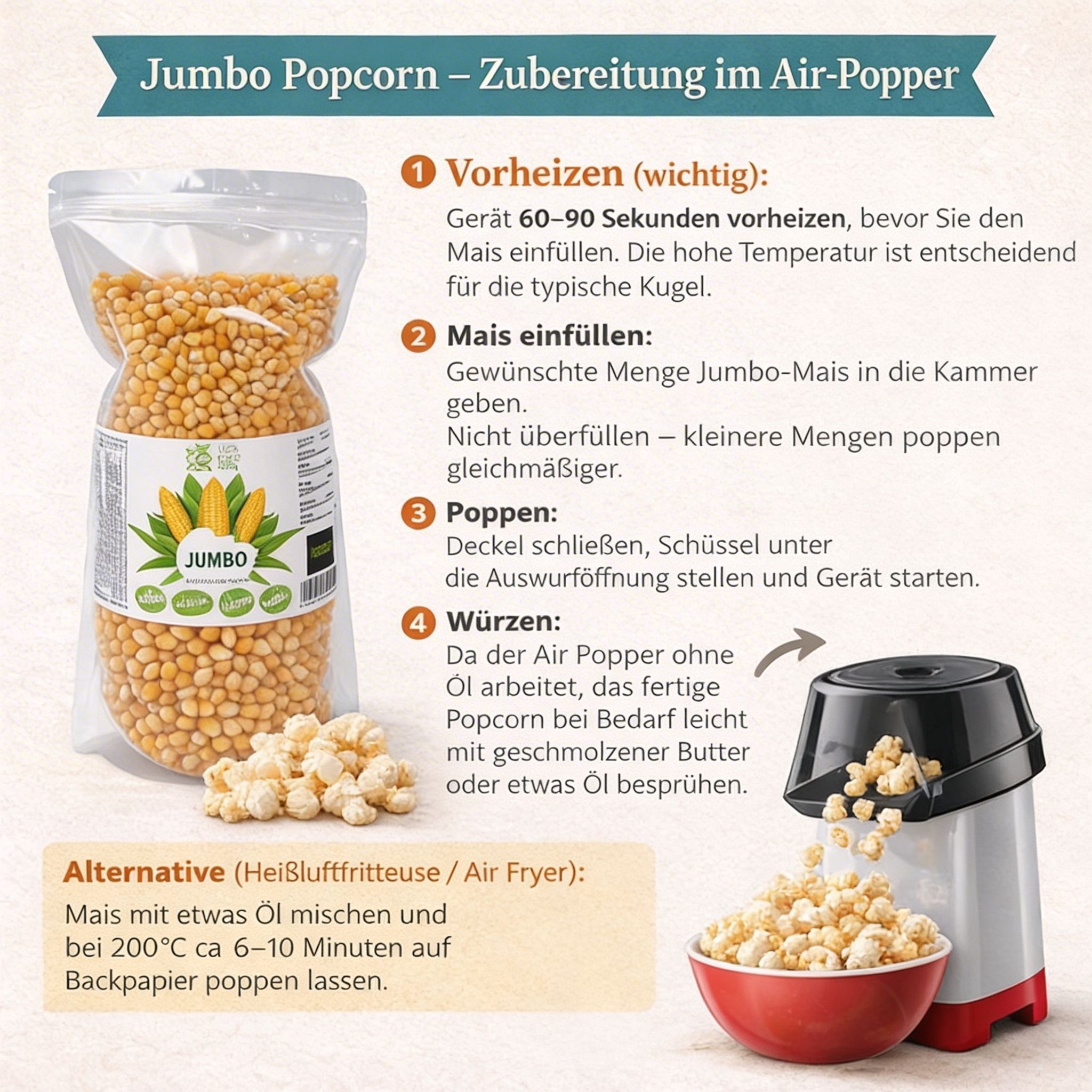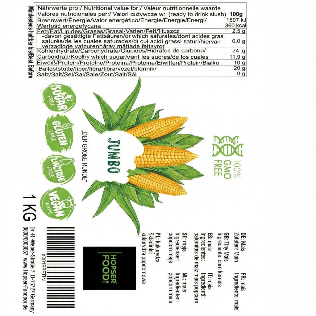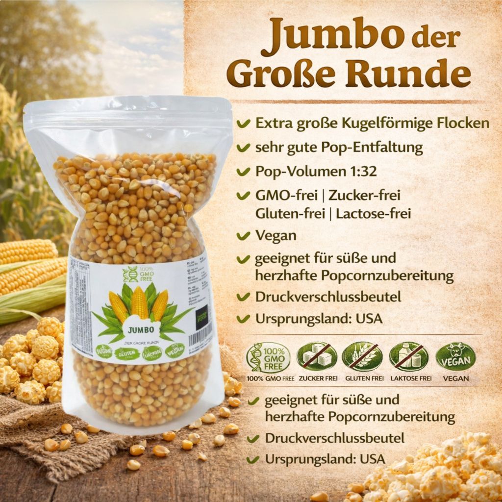 Hopser Funfood Jumbo Popcornmais 1kg GMO-frei Runde Flocke Popvolumen 1:32
