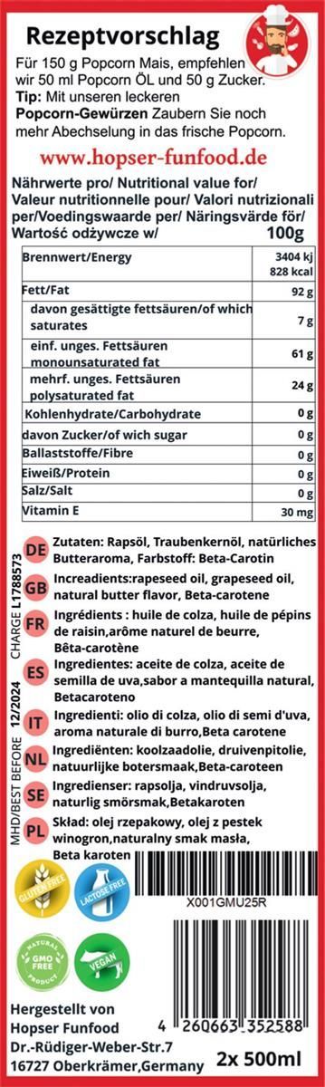 Hopser Funfood Popcorn Öl Buttergeschmack 1 Liter