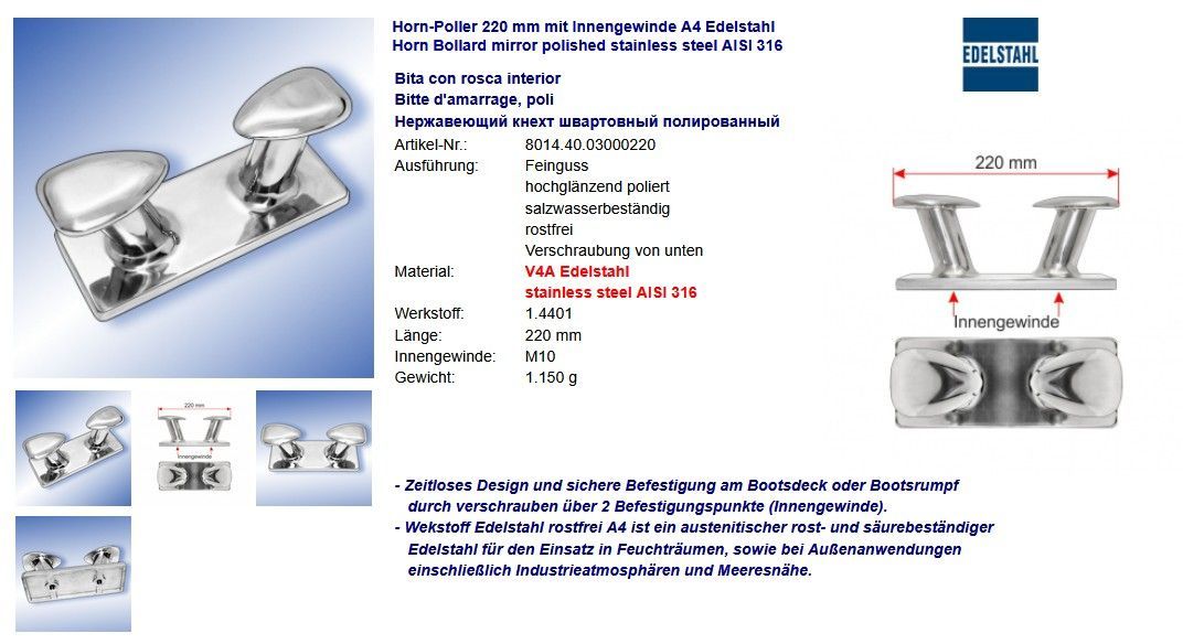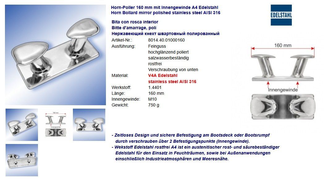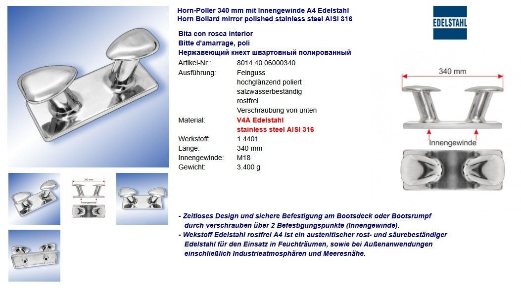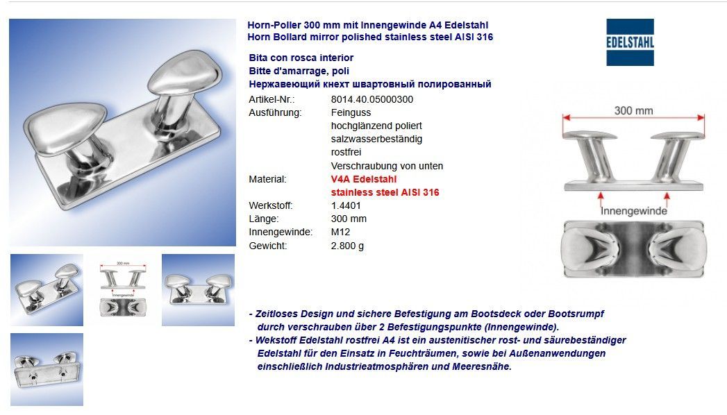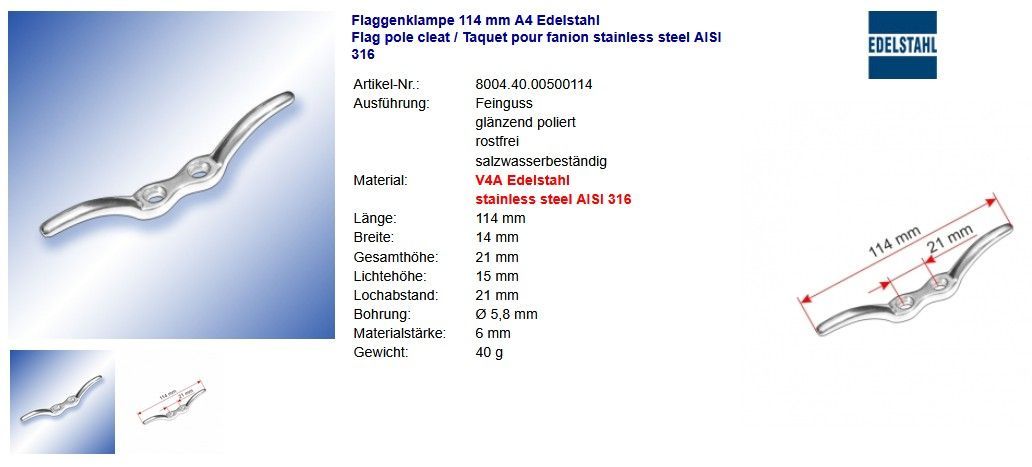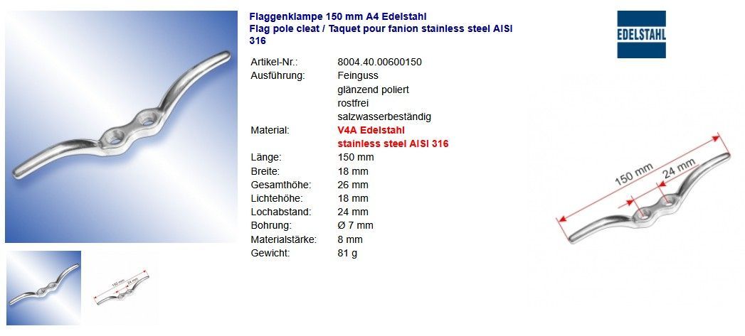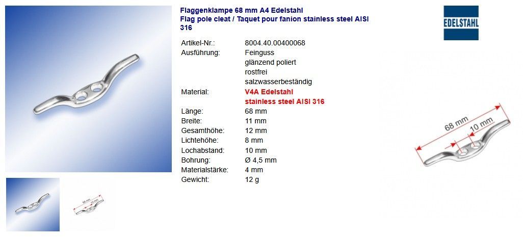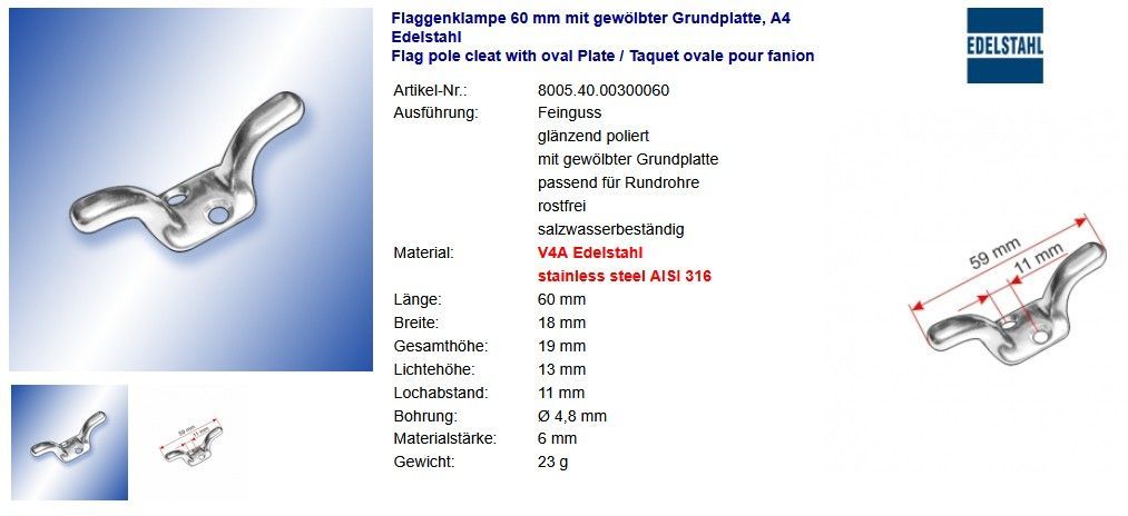 Horn-Poller A4 Edelstahl Hornpoller Klampen Flaggenklampen glänzend poliert Niro