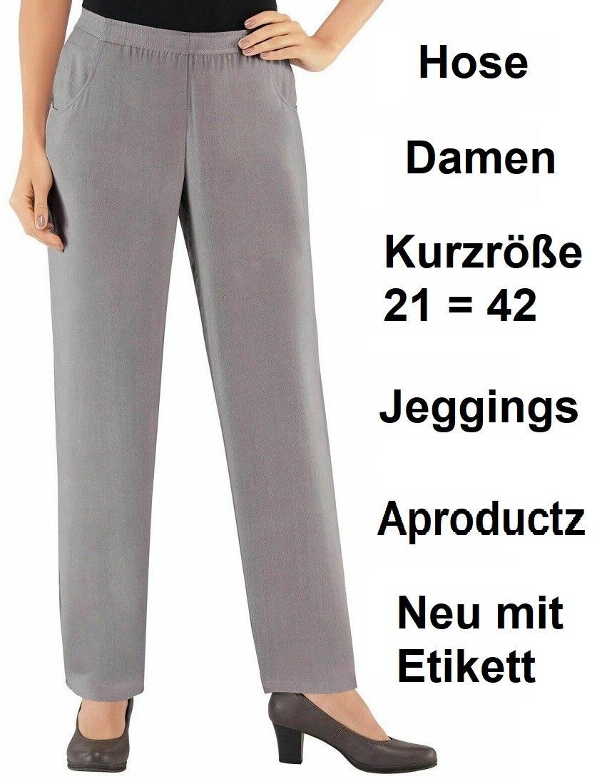 Hose Damen Kurzröße 21 = 42 Jeggings Aproductz Neu mit Etikett Stil: Jeggings Material: 52% Polyester, 48% Viskose Farbe: Grau Innenbeinlänge: 72 cm Wunderbar komfortabler Wohlfühlpartner im sommerleichten Viskose-Mix: Hose mit weich fließendem Fall und seidigem Griff. Beqeumer Rundum-Dehnbund. 2 Taschen. Versandkosten : 3,90 € / Abholung 0 €