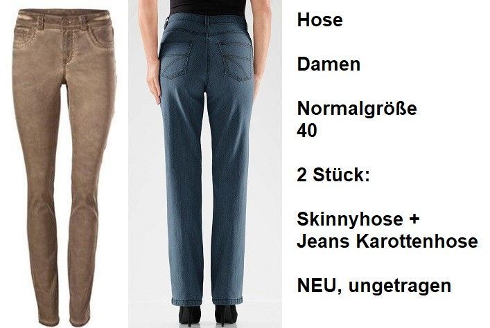 Hose Damen Normalgröße 40, 2 Stück: Skinnyhose + Jeans Karottenhose NEU, ungetragen. Sie bekommen 2 Hosen wie aufs Bild. 1- Skinnyhose: Marke: Heine. Farbe: camel. Maßgeschneidert. Innenbeinlänge: 73 cm. Materialzusammensetzung: Obermaterial: 98% Baumwolle, 2% Elasthan. 2- Jeans: Marke: Collection. Material: 98% Baumwolle, 2% Elasthan. Farbe: Blau / Blue Stone. Innenbeinlänge: ca. 74 cm Versandkosten: 5,90 € / Abholung 0 €