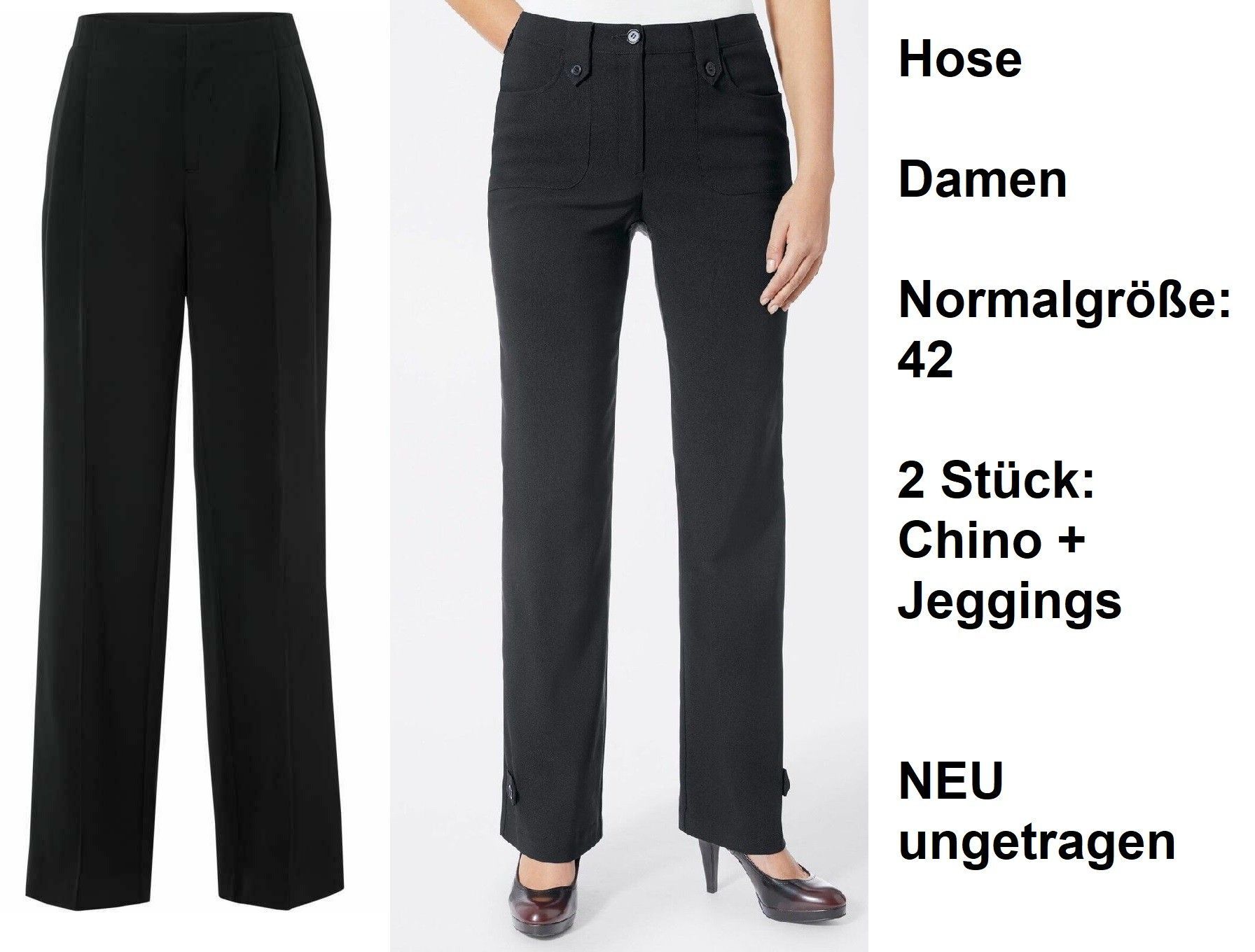 Hose Damen Normalgröße: 42, 2 Stück: Chino + Jeggings NEU, ungetragen. Produkte renommierter Hersteller und Versandhäuser zu sensationellen Preisen Sie bekommen 2 Hosen wie aufs Bild. 1- Marke: BodyFlirt: V1°4572, Stil: Chino, Farbe: Schwarz, Material: 90% Polyester, 10% Elasthan, Innenbeinlänge: 78 cm 2- Marke: Alessa W collection: V2°1468, Stil: Jeggings, Farbe: Schwarz, Material: 83% Polyester, 13% Viskose, 4% Elasthan, Innenbeinlänge: 74 cm