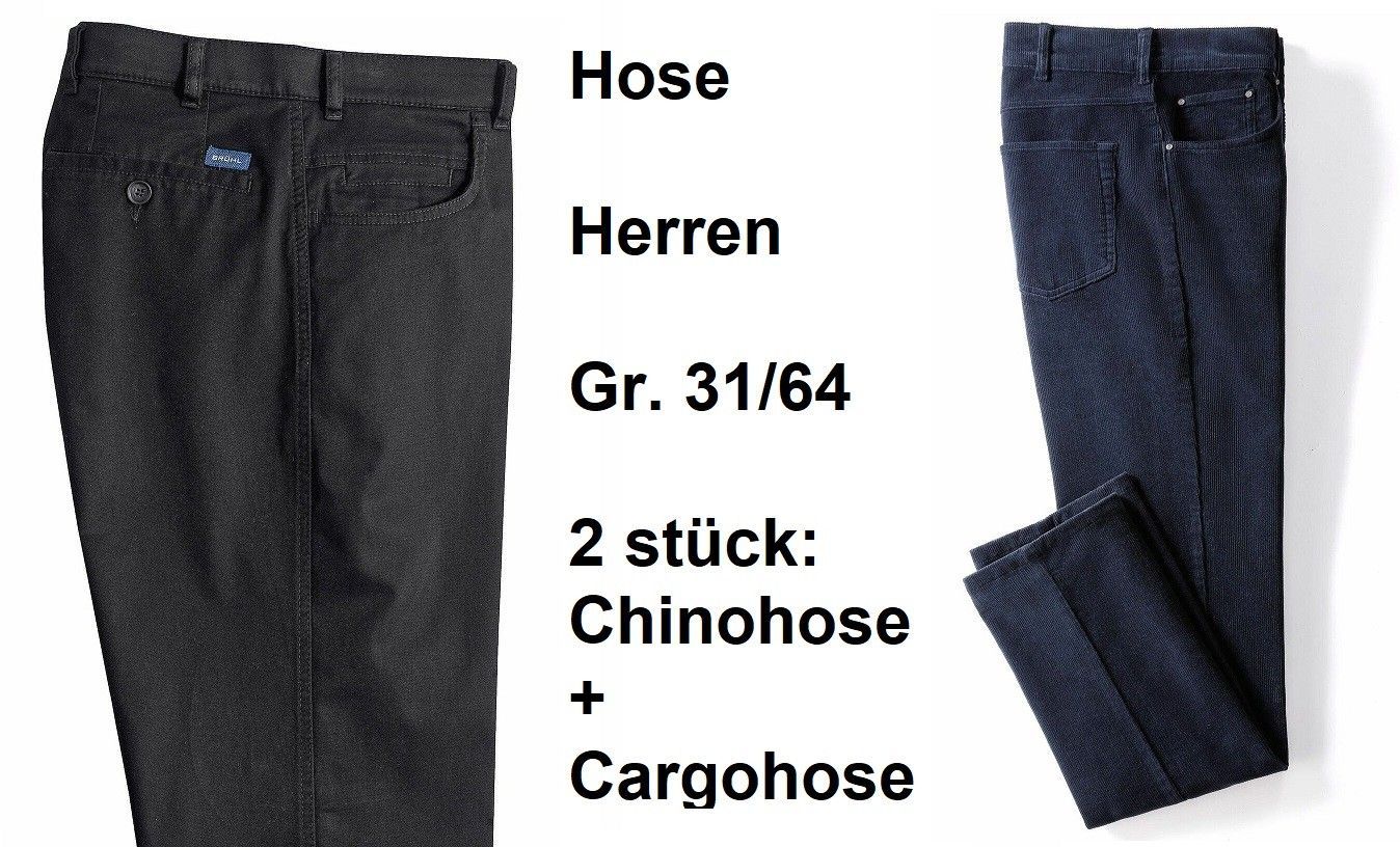 Hose Herren Gr. 31/64, 2 stück: Chinohose + Cargohose Neu mit Etikett Schrittlänge: Untersetztegröße 1- Marke: Brühl. Farbe: Schwarz. Chinohose Innenbeinlänge: 82 cm Material: 98% Baumwolle, 2% Elasthan 2- Marke: Catamaran. Farbe: blau marine. Cargohose Schrittlänge: 77 cm 98% Baumwolle, 2% Elasthan