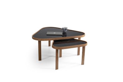 Set aus dreieckigen Beistelltischen mit schwarzer Tischplatte mit Marmormuster