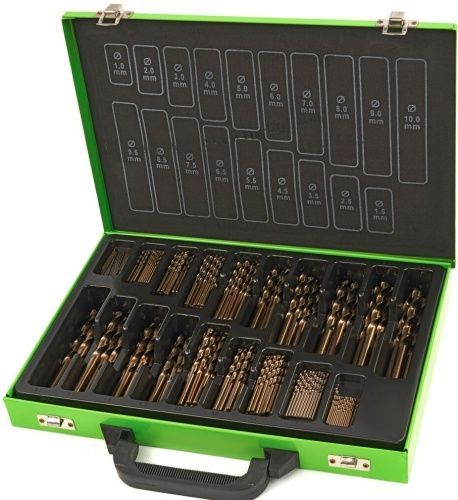 Dieses zinnbeschichtete Bohrerset enthält Bohrer in den Größen 1mm, 1,5mm, 2mm, 2,5mm, 3mm, 3,5mm, 4mm, 4,5mm, 5mm, 5,5mm, 6mm, 6,5mm, 7mm, 7,5mm, 8mm, 8,5mm, 9mm, 9,5mm, 10mm. Die HSS-Metallbohrer aus diesem Set bestehen zu 5% aus Kobalt und eignen sich zum Bohren in legierten, gehärteten oder rostfreien Stahl. Außerdem können diese Bohrer für Gusseisen genutzt werden. Um den Bohrer langlebig zu erhalten, sollte er während des Bohrvorgangs mit Bohröl gekühlt werden. Geordnet werden di