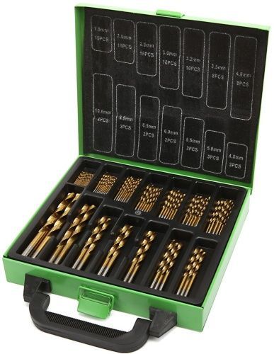 Dieses TiN-beschichtete Bohrerset enthält Bohrer in den Größen 1,5mm, 2mm, 2,5mm, 3mm, 3,2mm, 3,5mm, 4mm, 4,5mm, 5mm, 5,5mm, 6mm, 6,5mm, 8mm, 10mm. Geordnet werden die Bohrer in einer Stahlkassette geliefert. Das 99-teilige Set besteht aus: 16x1,5mm, 16x2mm, 15x2,5mm, 10x3mm, 10x3,2mm, 8x3,5mm, 8x4mm, 3x4,5mm, 3x5mm, 2x5,5mm, 2x6mm, 2x6,5mm, 2x8mm, 2x10mm.