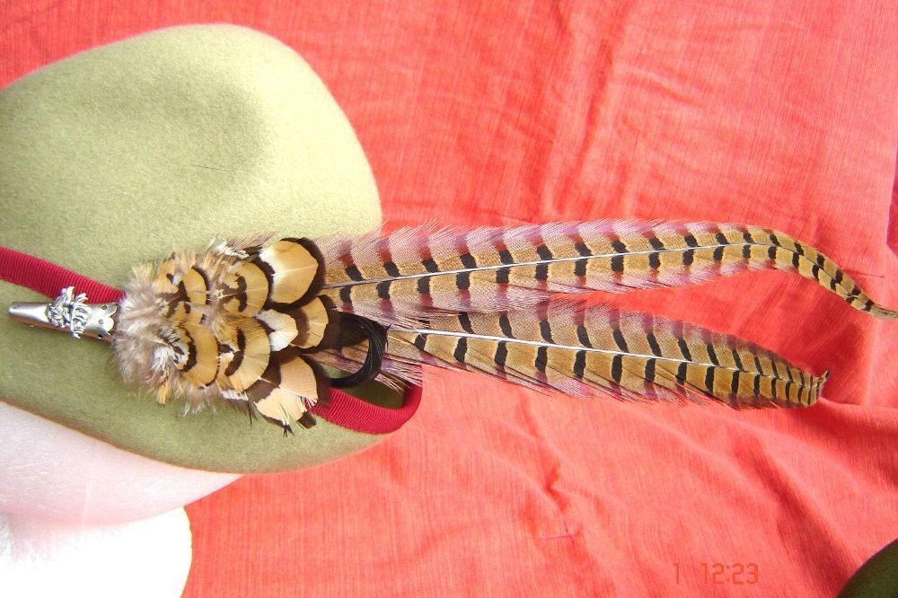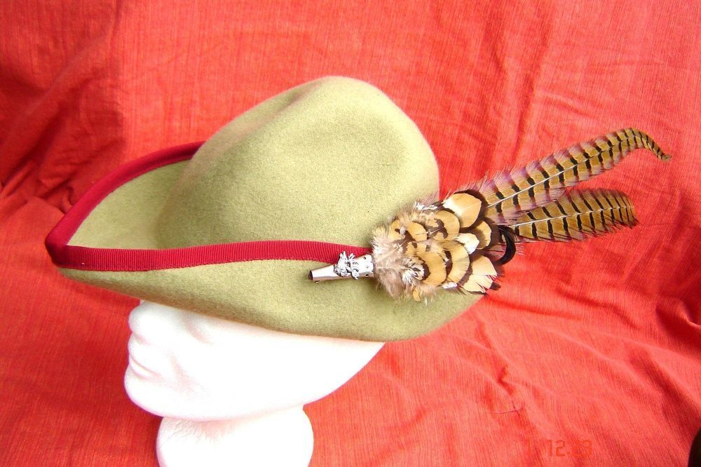 . Hubertuskappe , schmaler Hubertushut aus Wollfilz , 100% Wolle in Farbe helloliv mit weinrotem Einfaß dazu passend ein langes Fasanfedergesteck mit Halter sehr gut ausgerüstet mit breitem Baumwollstretchband innen hochwertig verarbeitet aus eigener Herstellung lieferbare Größen 55 , 56 , 57 , oder