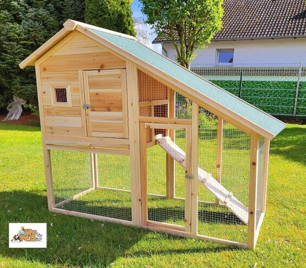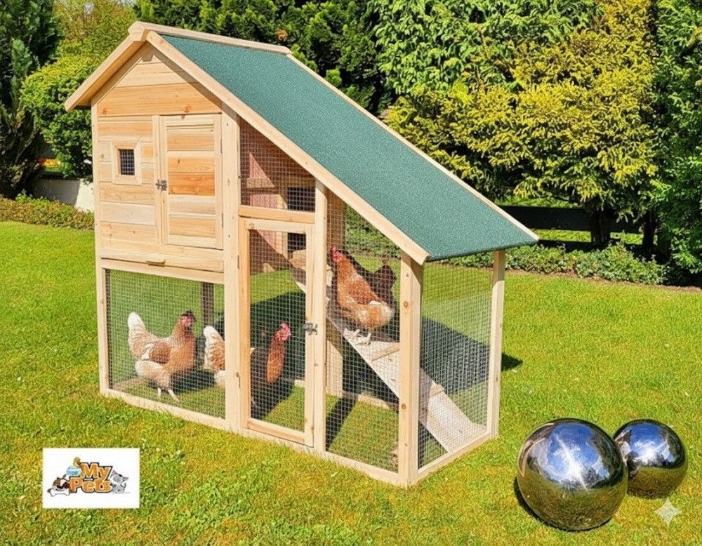 Dieser Käfig bietet Ihrem Tier viel Freiraum und Komfort. Ein tolles Zuhause für Ihre Hühner und anderes Geflügel. Großer Hühnerstall der Marke MyPets® CROSSI XXL - neues Modell Viel Auslauf auf 2 Ebenen - Witterungsgeschütztes 3-fach lasiertes Tannenholz mit Imprägnierung Das besondere Extra an