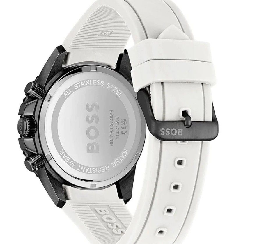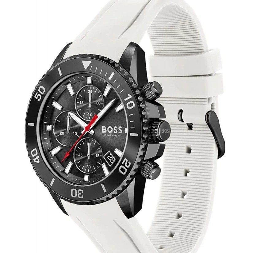 Hugo Boss HB 1513966 Herrenuhr Admiral. Dieser stilvolle Chronograph verfügt über ein 46 mm großes schwarzes PVD-Edelstahlgehäuse, eine schwarze drehbare Lünette, ein schwarzes Zifferblatt und ein weißes Kautschukarmband. Modell: HB 1513966 Garantie: 1 Jahre Gehäuse: Schwarzes PVD Edelstahl Armband: