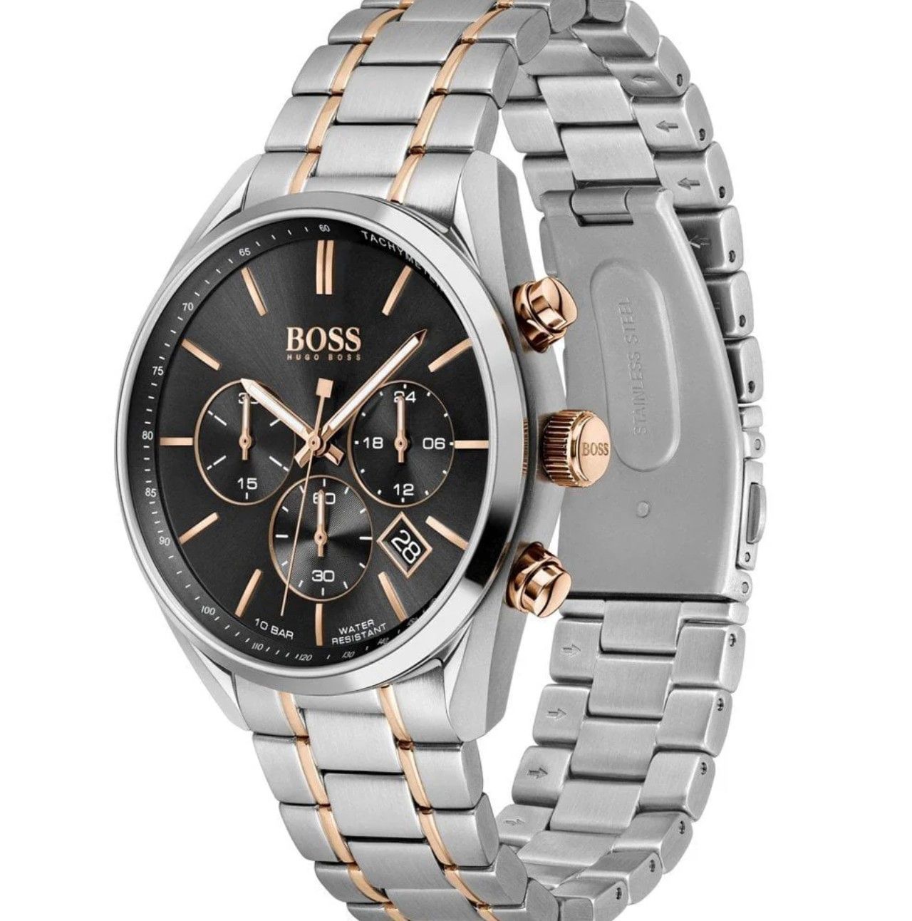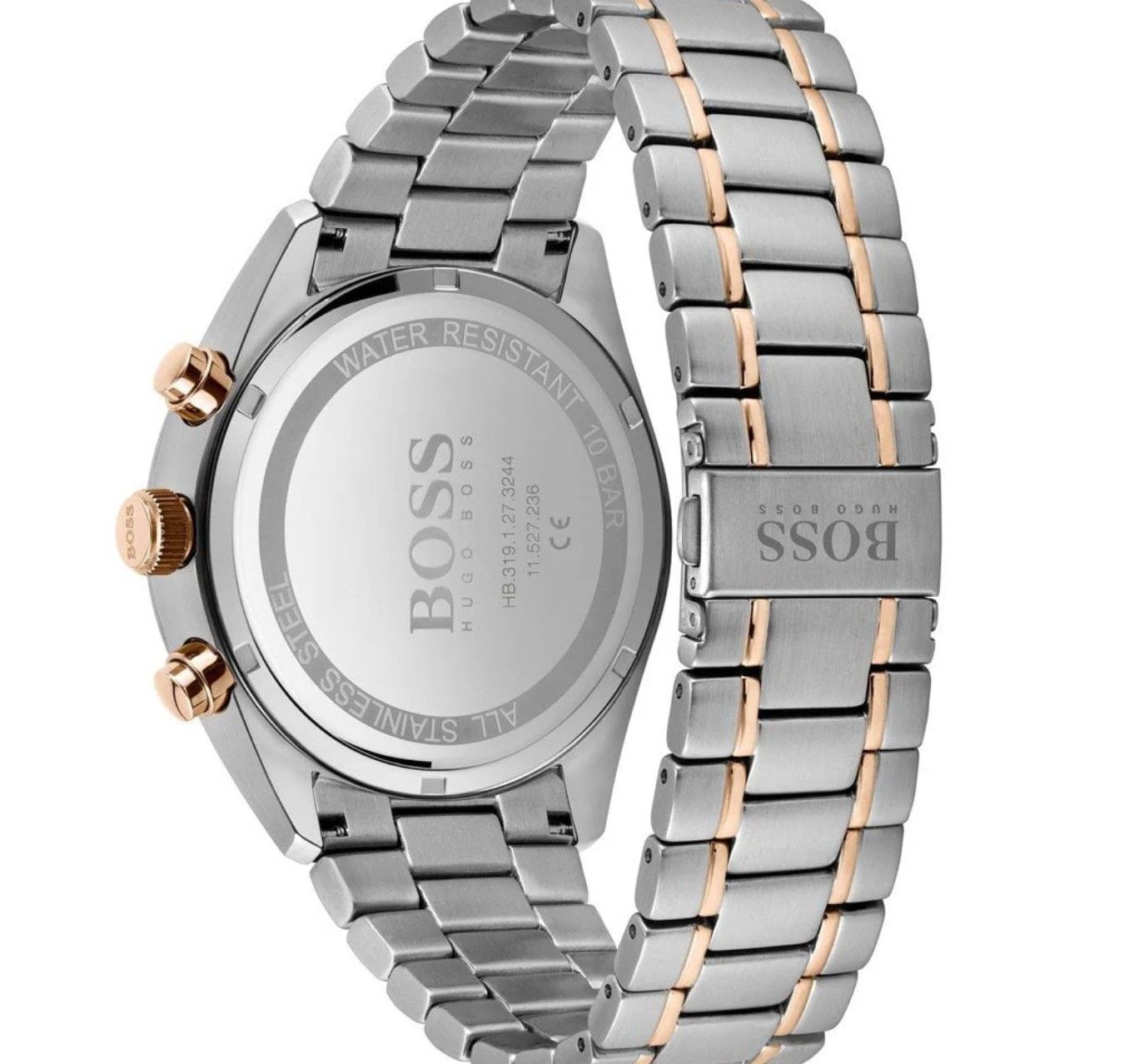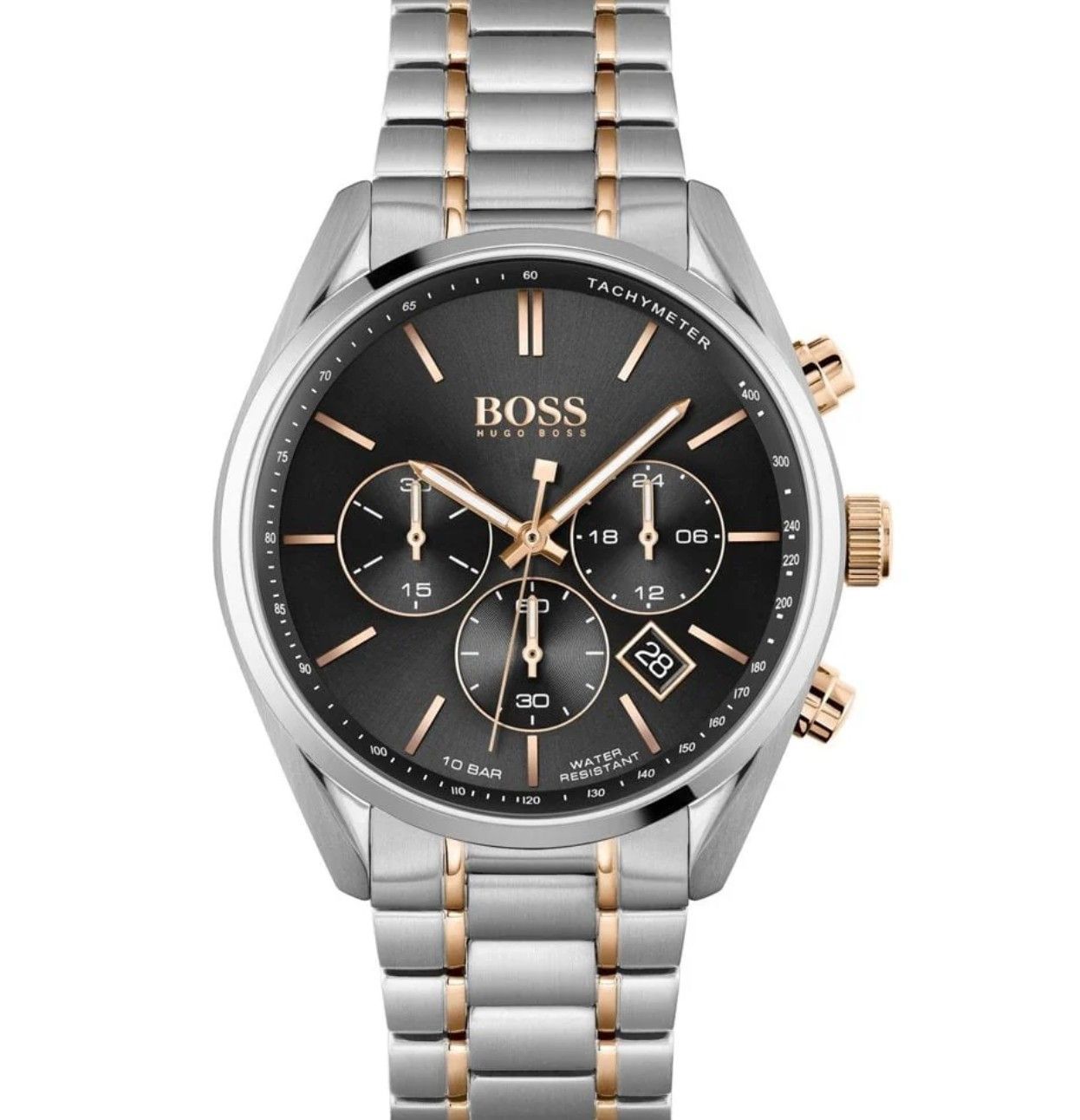 Hugo Boss HB 1513819 Herrenuhr Champion. Das Gehäuse besteht aus zweifarbigem Stahl mit Roségoldbeschichtung, und das schwarze Zifferblatt verleiht der Uhr einen einzigartigen Look. Zu den Funktionen der Uhr gehören ein Chronograph und eine Datumsanzeige. Modell: HB 1513819 Garantie: 1 Jahre Gehäuse