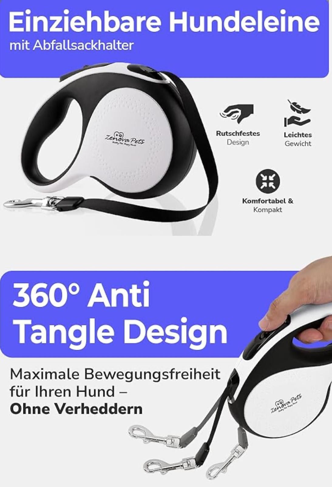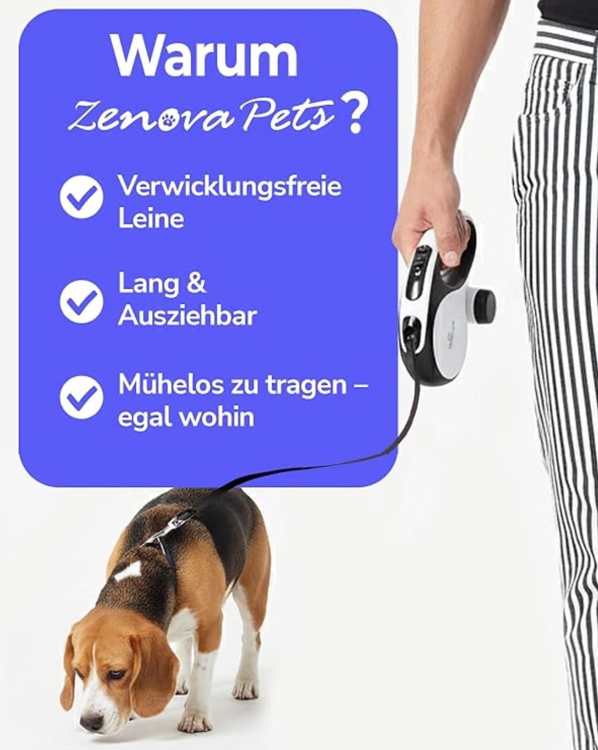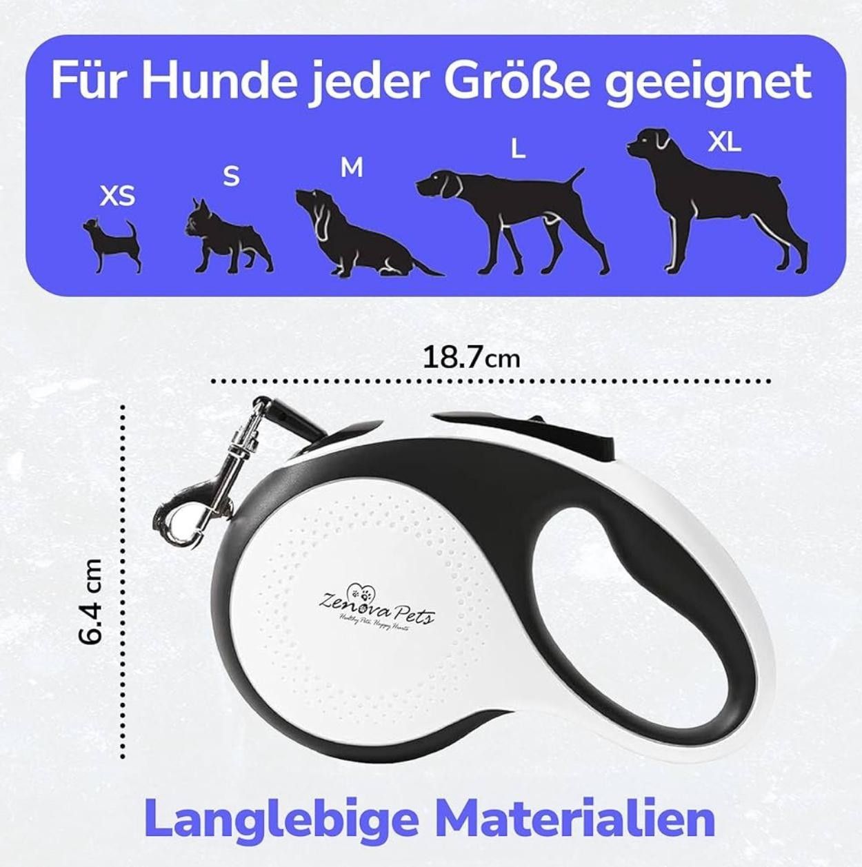 Hunde Rollleine 5 m – Sicherheit, Komfort und volle Kontrolle Die hochwertige Hunde Rollleine von ZENOVA PETS bietet optimale Kontrolle, hohen Tragekomfort und maximale Bewegungsfreiheit bei jedem Spaziergang. Das 5 Meter lange, ausziehbare Nylonband ermöglicht Ihrem Hund ein freies Laufen, während