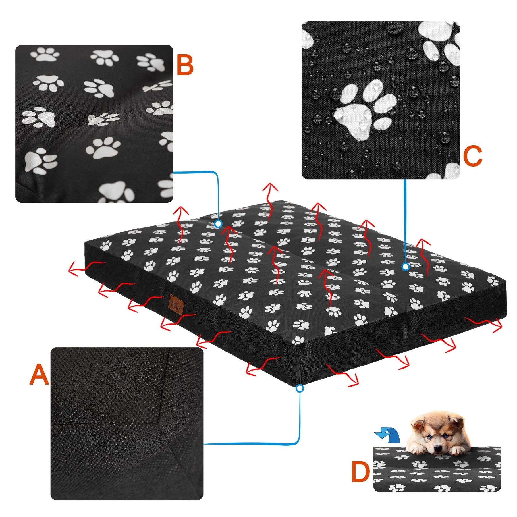 • Hundebett, rechteckige Matratze, wasserdicht 70x50cm, schwarz mit Pfoten