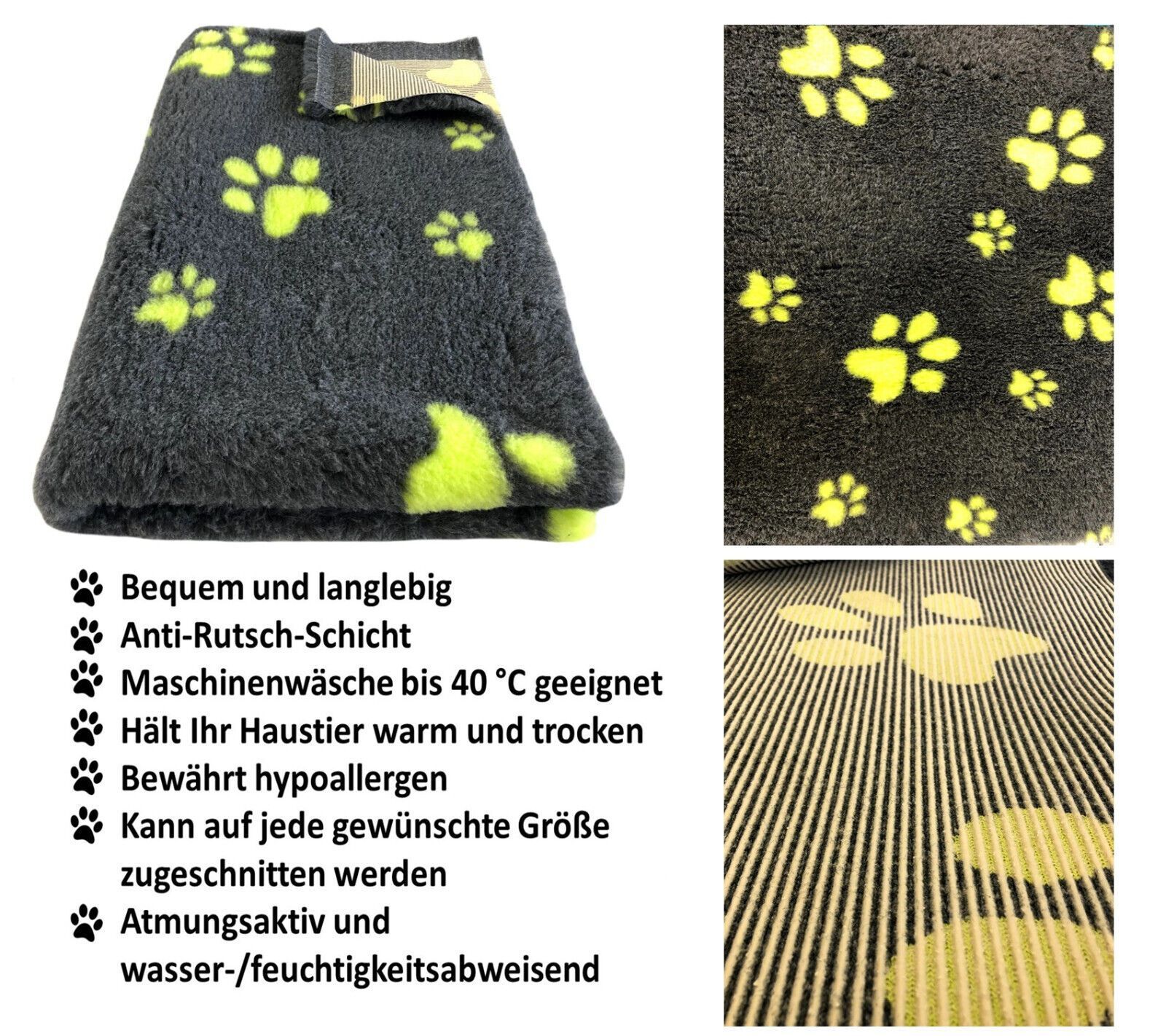 Hundedecke Vet Bed Original Premium Qualitätsstufe Dunkelgrau + Pfote Grün S/ M/ L