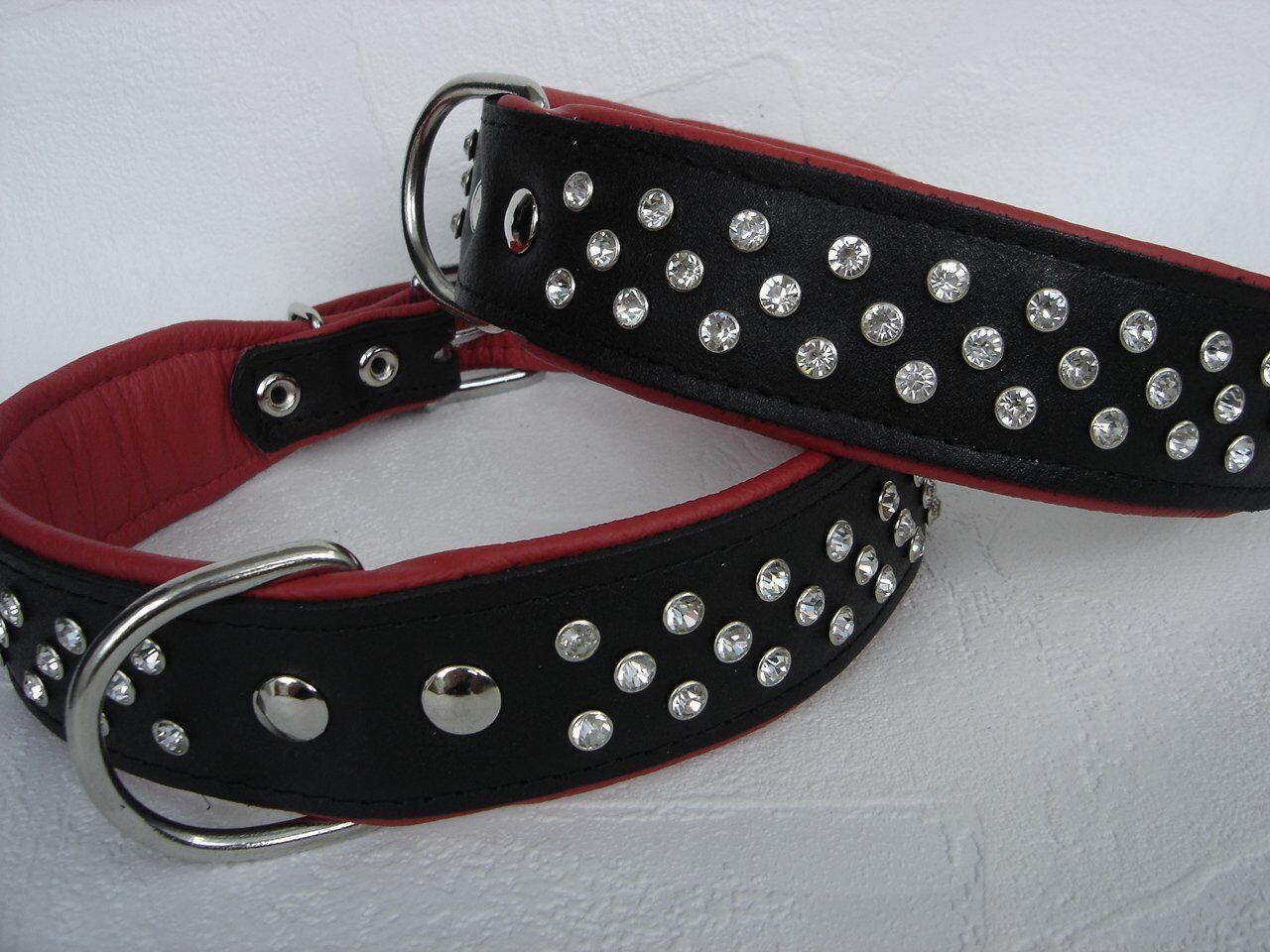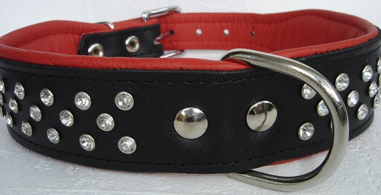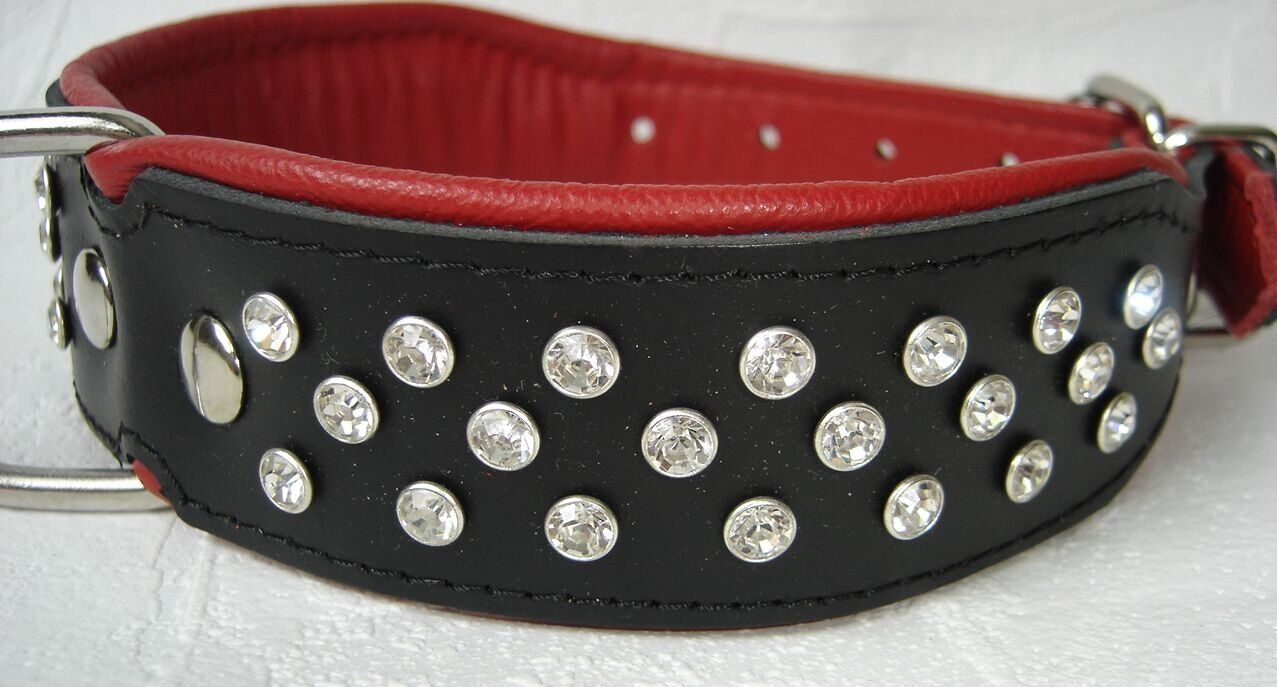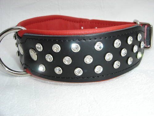 Lederhalsband mit Kristallen *** SCHWARZ - ROT *** Maße: Gesamtlänge : 57 cm Halsumfang : 43 - 51 cm (erste und letzte Loch) Breit : 40 mm Messen Sie hierzu bitte den Hals ihres Hundes. Material : - 100 % hochwertiges Leder, sehr robust - verziert mit großen (0,5 cm) Kristallen - vernäht und gepolst