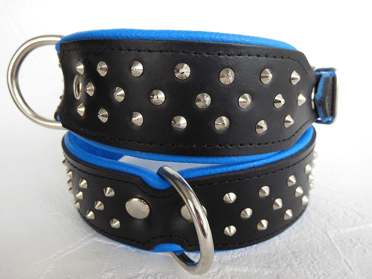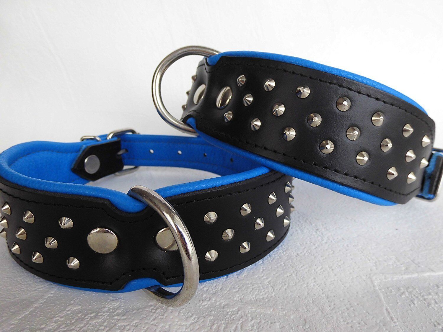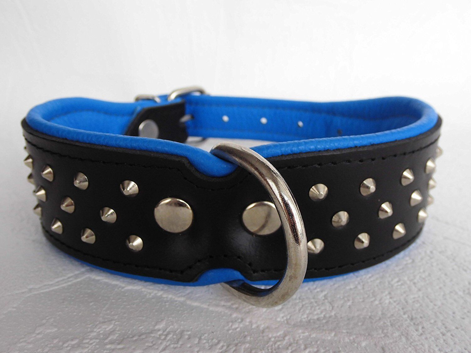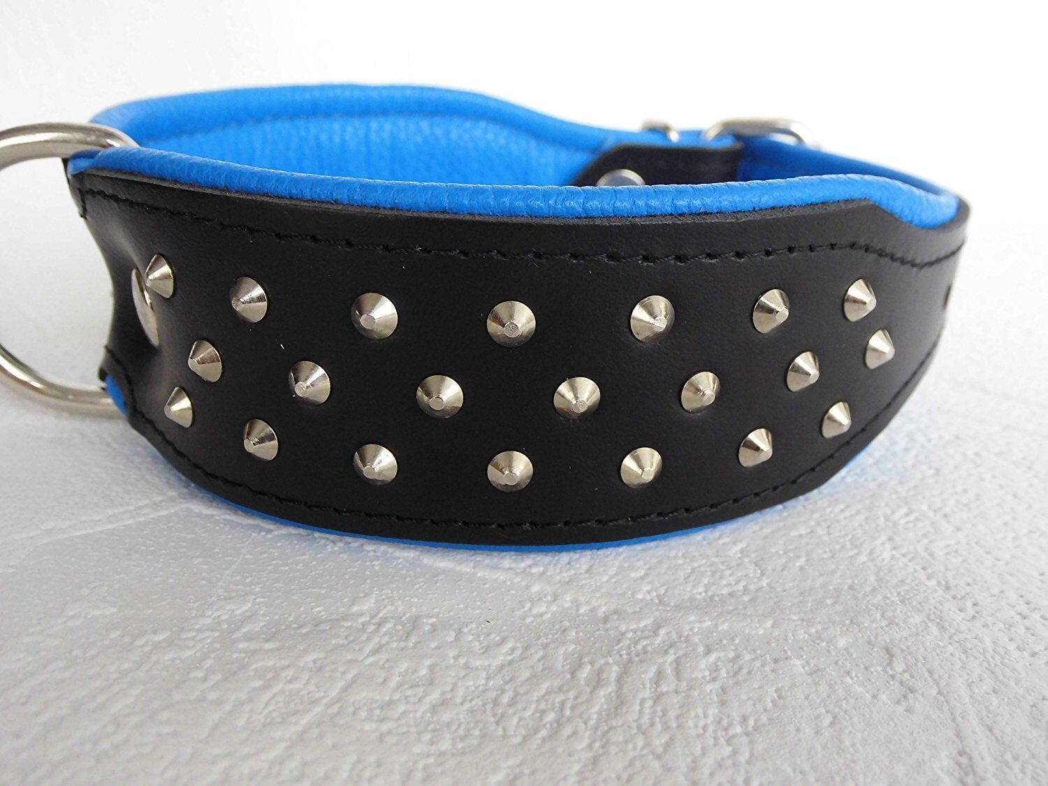 Lederhalsband mit Nieten *** BLAU *** Maße: Gesamtlänge : 46 cm Halsumfang : 33 - 41 cm Breit : 40 mm Messen Sie hierzu bitte den Hals ihres Hundes. Material : - 100 % hochwertiges Leder, sehr robust - verziert mit runden Kopfnieten - vernäht und gepolstert mit weichem Leder Nach dem Einkauf - unzuf