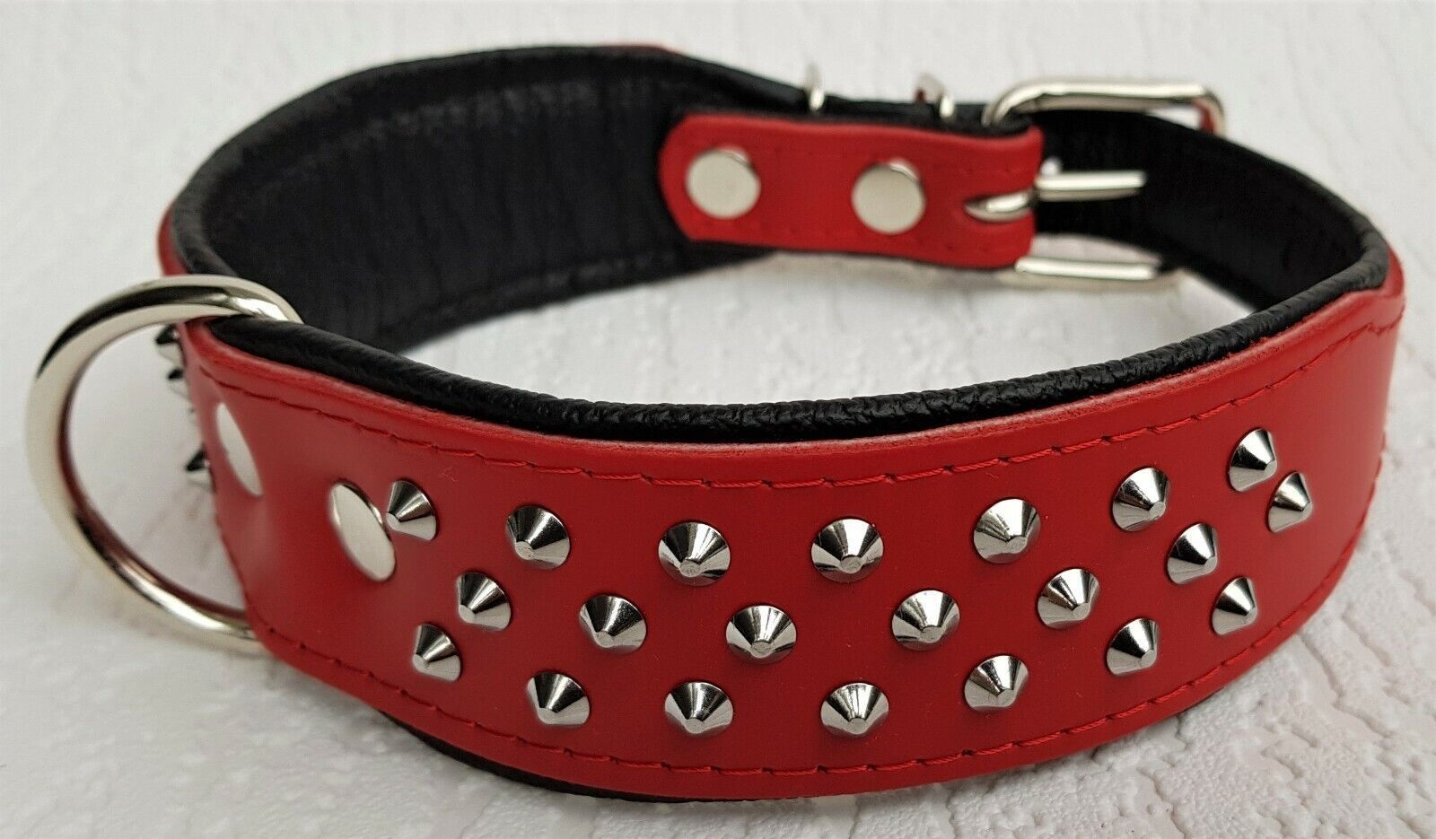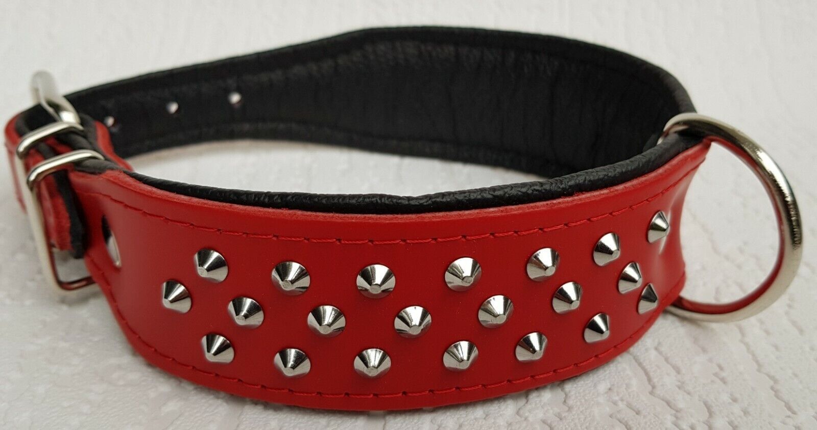 Lederhalsband mit Nieten *** Rot - Schwarz*** Maße: Gesamtlänge : 50 cm Halsumfang : 38 - 46 cm Breit : 40 mm Messen Sie hierzu bitte den Hals ihres Hundes. Material : - 100 % hochwertiges Leder, sehr robust - verziert mit runden Kopfnieten - vernäht und gepolstert mit weichem Leder Nach dem Einkauf