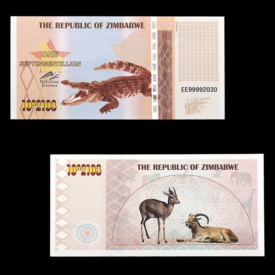 Diese Auflistung ist für eine extra feine Hundred Septing Billion Simbabwe Diese Simbabwe Note war ein Teil der Serie Inflationswährung. Die Scheine haben unterschiedliche Seriennummern und gelten nur als Fantasy Banknoten weil sie zu keiner Zeit im Handel waren!!! Mehr als ein Jahrzehnt nach ihrer