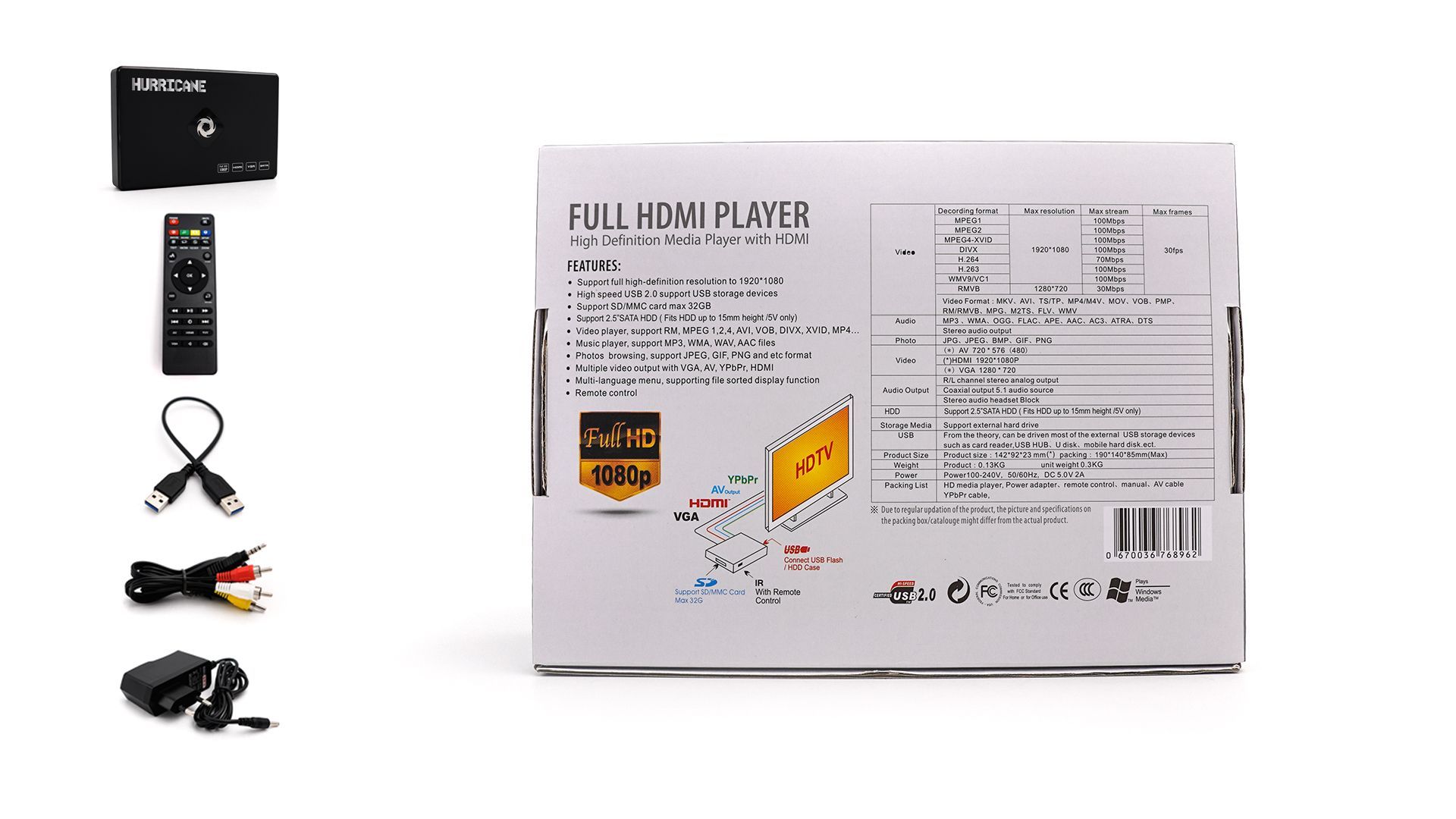Full HD 1920x1080, HDMI. SD Card slot (max 32GB), USB 2.0 slot Video: RM, MPEG (1,2,3), AVI, VOB, DIVX, XVID, MP4 Audio: MP3, WMA, WAV, AAC files Photo: JPEG, GIF, PNG supported file system: only FAT and ExFAT(no NTFS, APFS, etc.) Lieferumfang : MediaPlayer, Netzteil, USB Kabel, AV Kabel, Fernbedien... Mehr