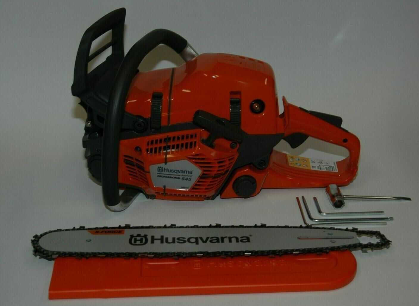 Neue Husqvarna 545 Mark II Motorsäge, inklusive original Husqvarna 50cm Schwert und 2x Sägeketten, Technische Daten: Hubraum: 50,1ccm Leistung: ca. 2,7kW 3,7PS Gewicht: ca. 5,3kg ( ohne Schneidausrüstung) Sägekettenteilung: 325 1,3mm Der Artikel ist neu. Es wird eine Rechnung mit ausgewiesener MwSt.