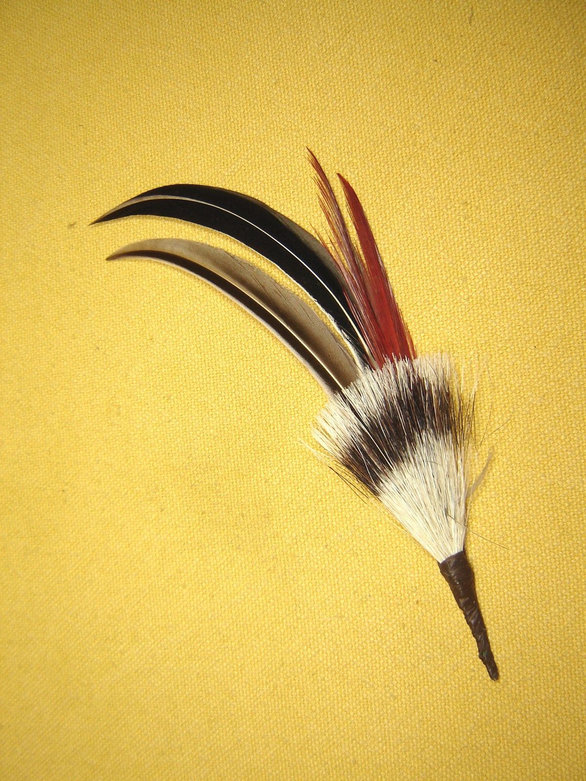. Musikantenfeder Schützenfeder Hutfeder 2 fach nach links gebogen , am Hut also nach oben oder hinten um den Hut rum klassische Hutfeder für Tracht , Einzelstück aus Altbestand als Reiherersatz schwarzweiß gestreifte Feder ,kleiner Dachsbart mit roter Fasanfeder und kleinem Flaum reine Federlänge i