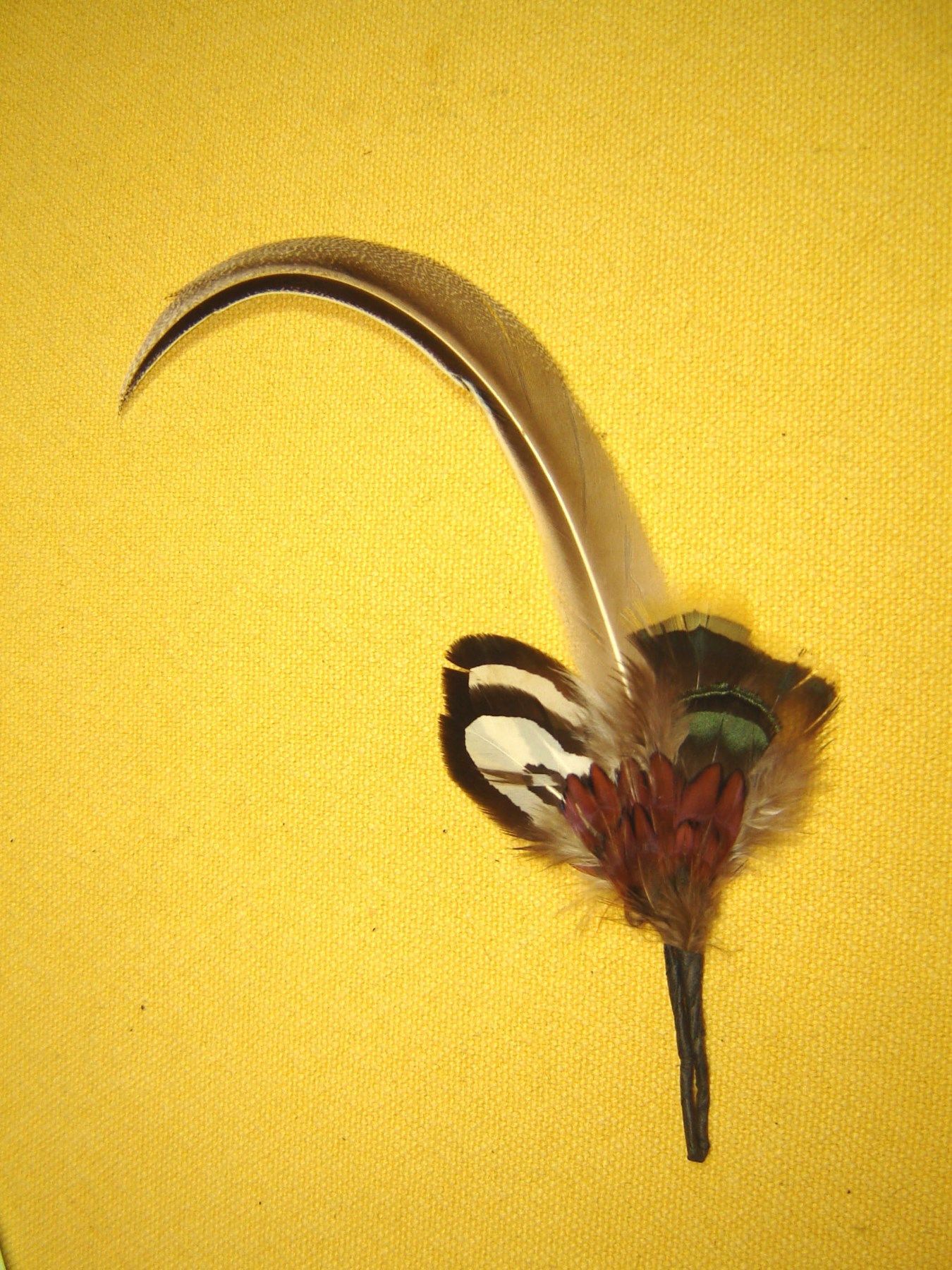 . Musikantenfeder Schützenfeder Hutfeder 1 fach nach links gebogen klassische Hutfeder für Tracht als Reiherersatz braun weiß gestreifte Feder mit bunten Federn reine Federlänge ist ca 16 cm auf Wunsch auch mit Halter , H362III 6,- Euro Natürlich werden keine Federn oder Haare von Tieren verwendet ,
