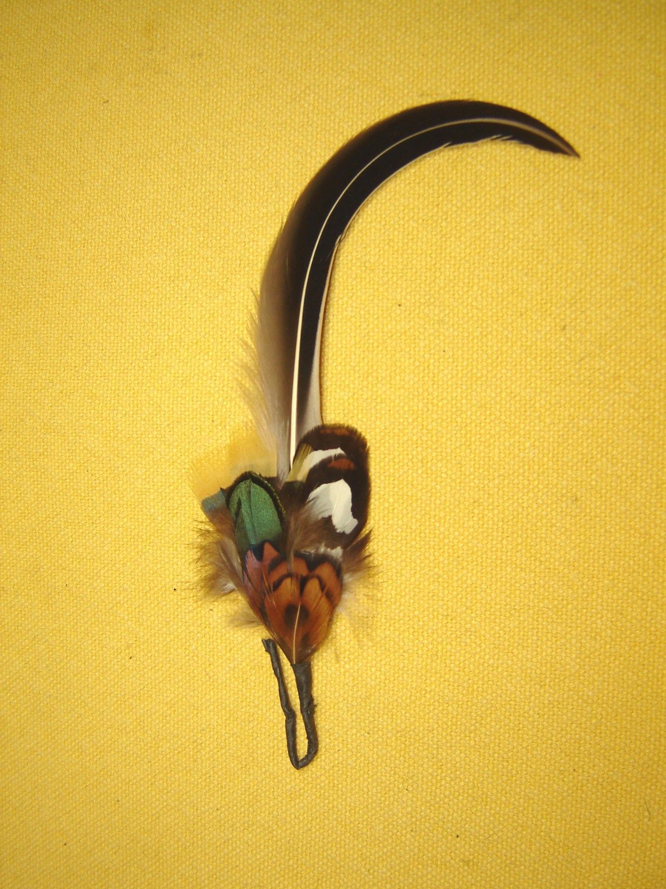 . Musikantenfeder Schützenfeder Hutfeder 1 fach nach rechts gebogen klassische Hutfeder für Tracht als Reiherersatz braun weiß gestreifte Feder mit bunten Federn reine Federlänge ist ca 16 cm auf Wunsch auch mit Halter , H362III 6,- Euro Natürlich werden keine Federn oder Haare von Tieren verwendet