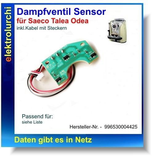 Sie bieten hier auf folgenden Artikel 1 Stück HWD Dampfventil-Sensor-Saeco Odea Go, Giro, Plus, Orange, 996530004425 Komplett wie abgebildet mit Kabel und Stecker Funktion: Diese Saeco Elektronik Platine befindet sich im Vollautomaten beim Ventilkörper für den Dampfbezug (Art.Nr.: 996530067768). Auf