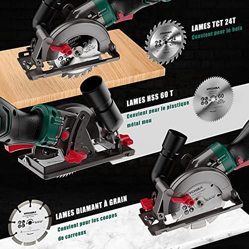 Leistungsstarker Motor und 3 Flügel: Der 750-W-Motor aus reinem Kupfer bietet eine hohe Drehzahl von 3500 U min. Die kleine Kreissäge wird mit 3 Sägeblättern geliefert: 24T TCT-Sägeblätter für Holz, 60T HSS-Sägeblätter für Kunststoff, Diamantklingen für Fliesen. Einstellbare Tiefe und Winkel: Der Sc... Mehr