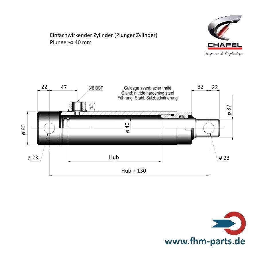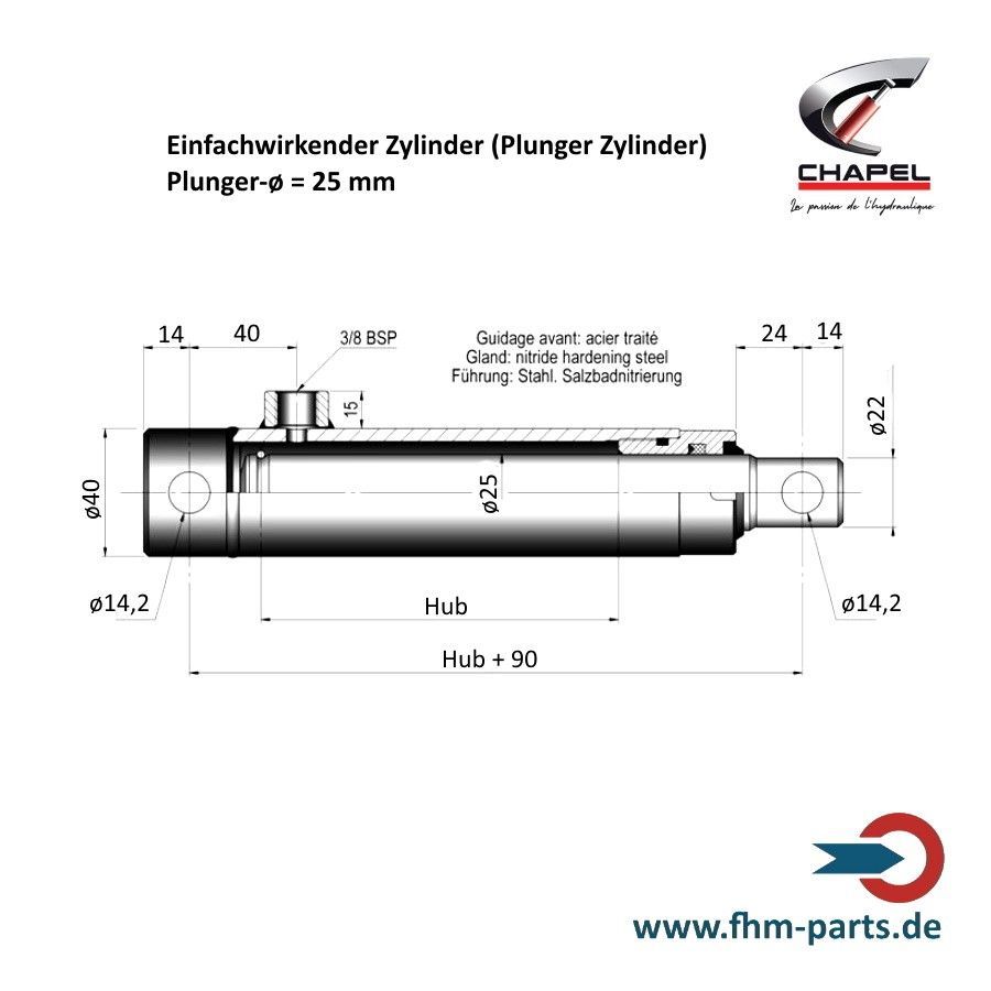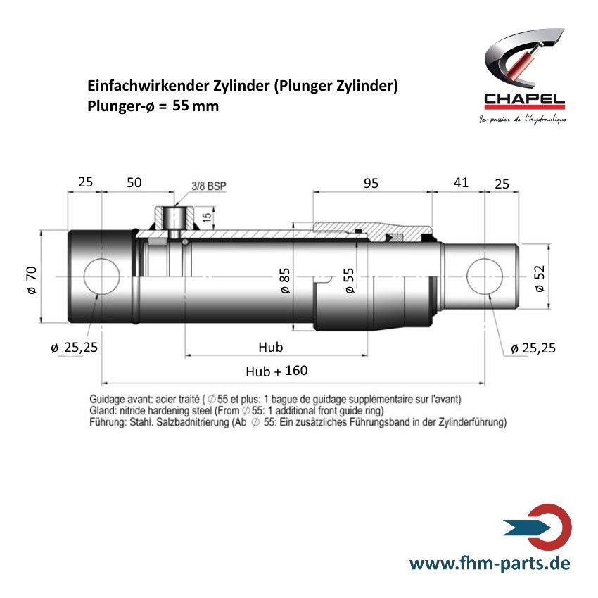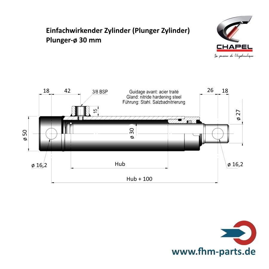 Hydraulikzylinder einfachwirkend Chapel Plungerzylinder und Dichtsätze Kolben Plunger-ø 25, 30, 40, 45, 50, 55, 60 oder 70 mm Hub 100 - 700 mm Führung: Stahl salzbadnitriert, ab ø 55 mm zusätzliches Führungsband Jeder Zylinder wird vor Auslieferung einer strengen Qualitätsprüfung unter