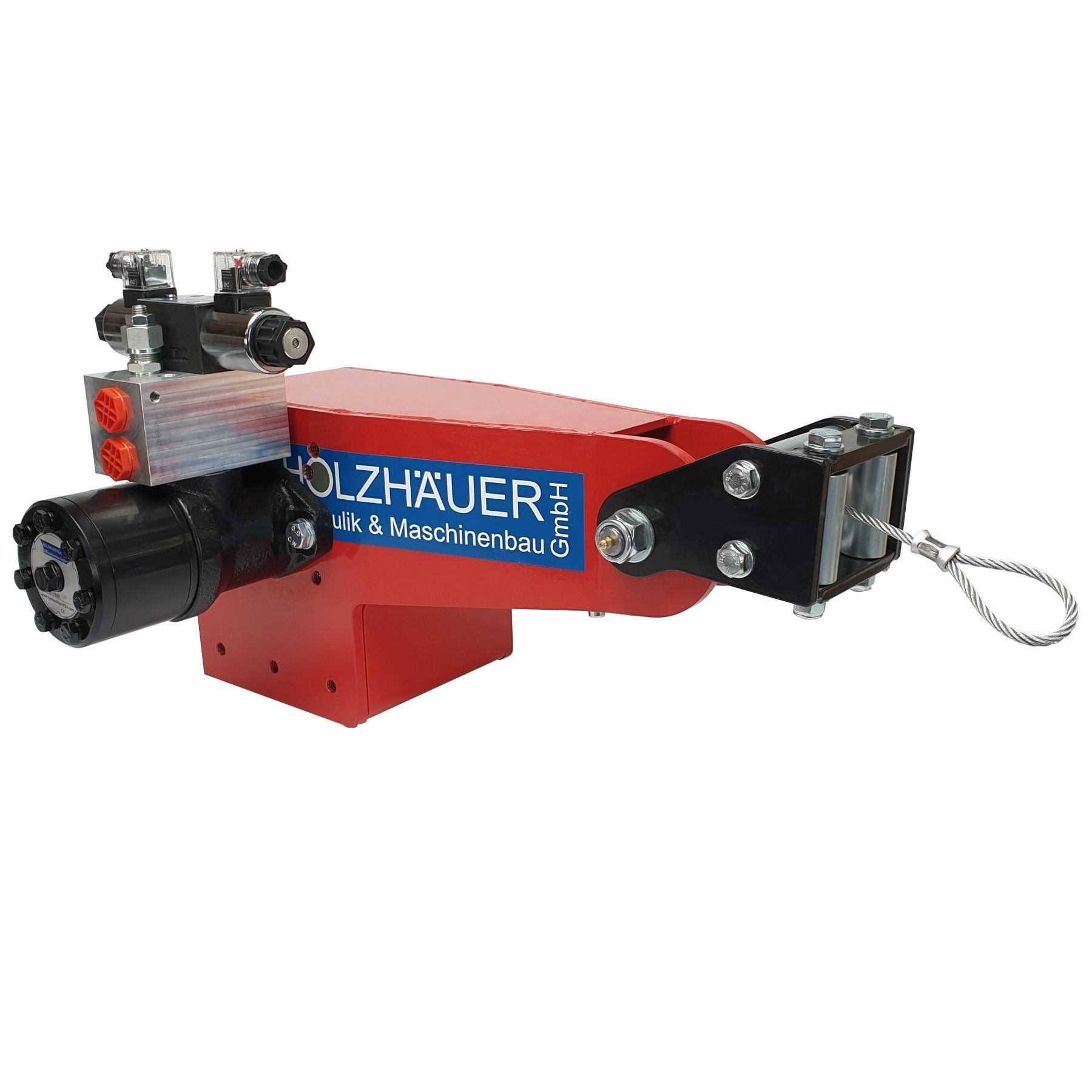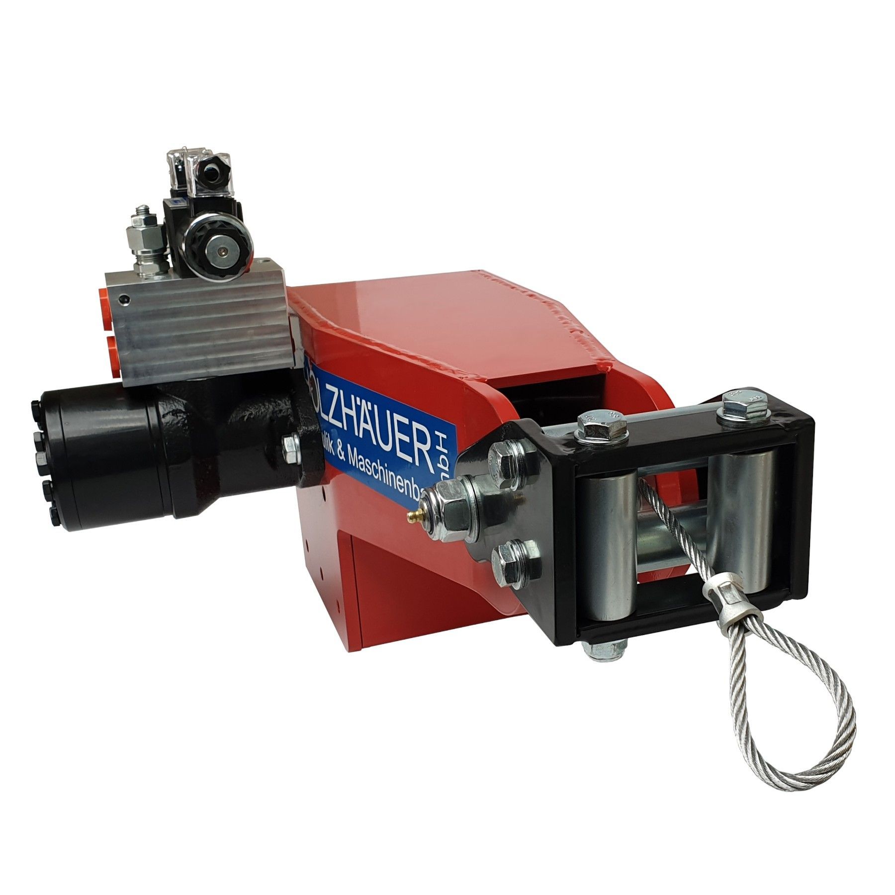 Hydraulische Seilwinde HAW1700 mit elektrischem Ventil Standardmässig ist der Motor auf der rechten Seite (Blickrichtung vom Seileinlauf) verbaut. Der Motor kann auf Wunsch auch auf der linken Seite verbaut werden, Aufpreis: 50 €. Hydraulische Seilwinde HAW1700 mit elektrischem Ventil für den A